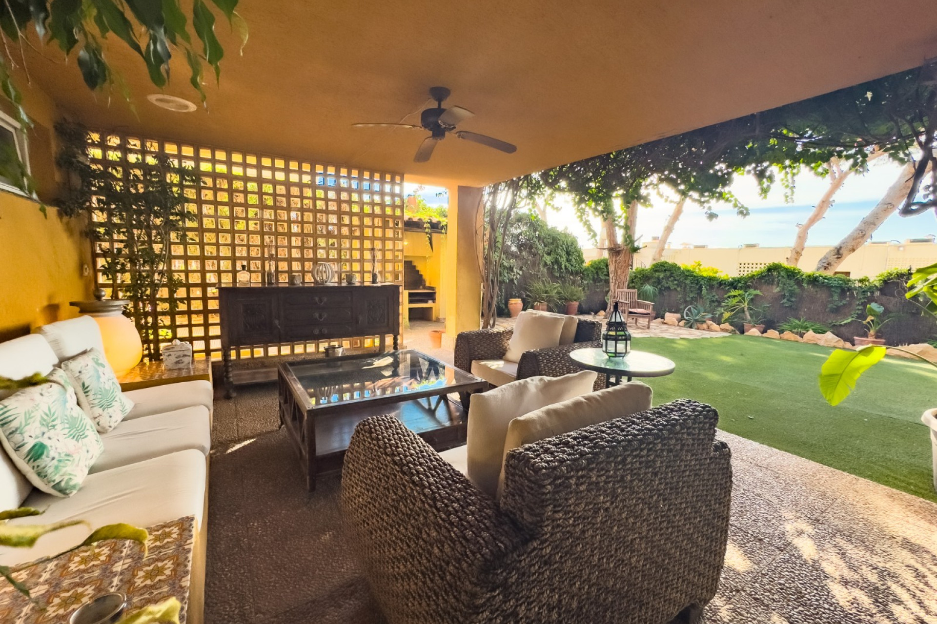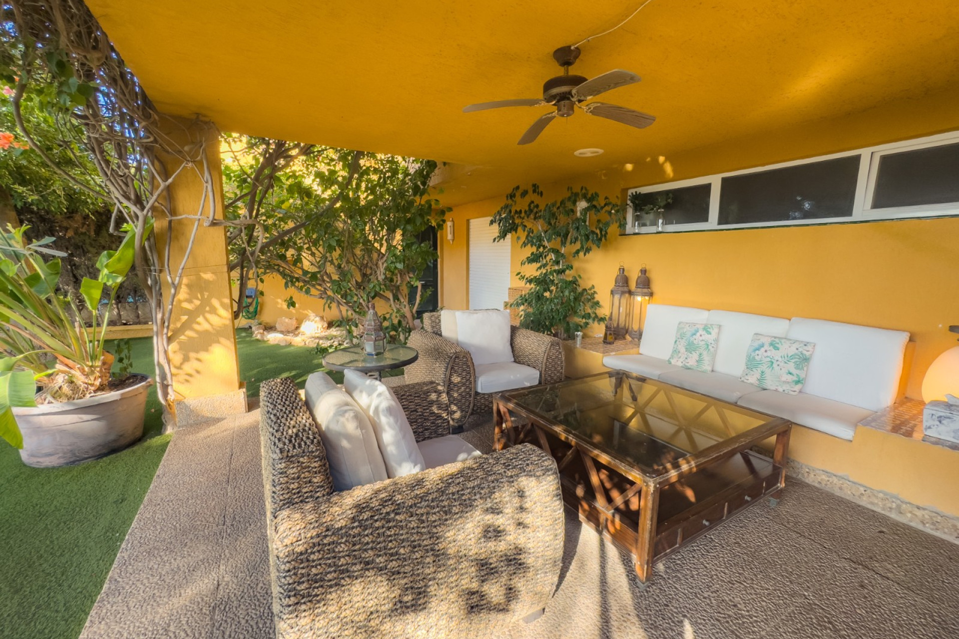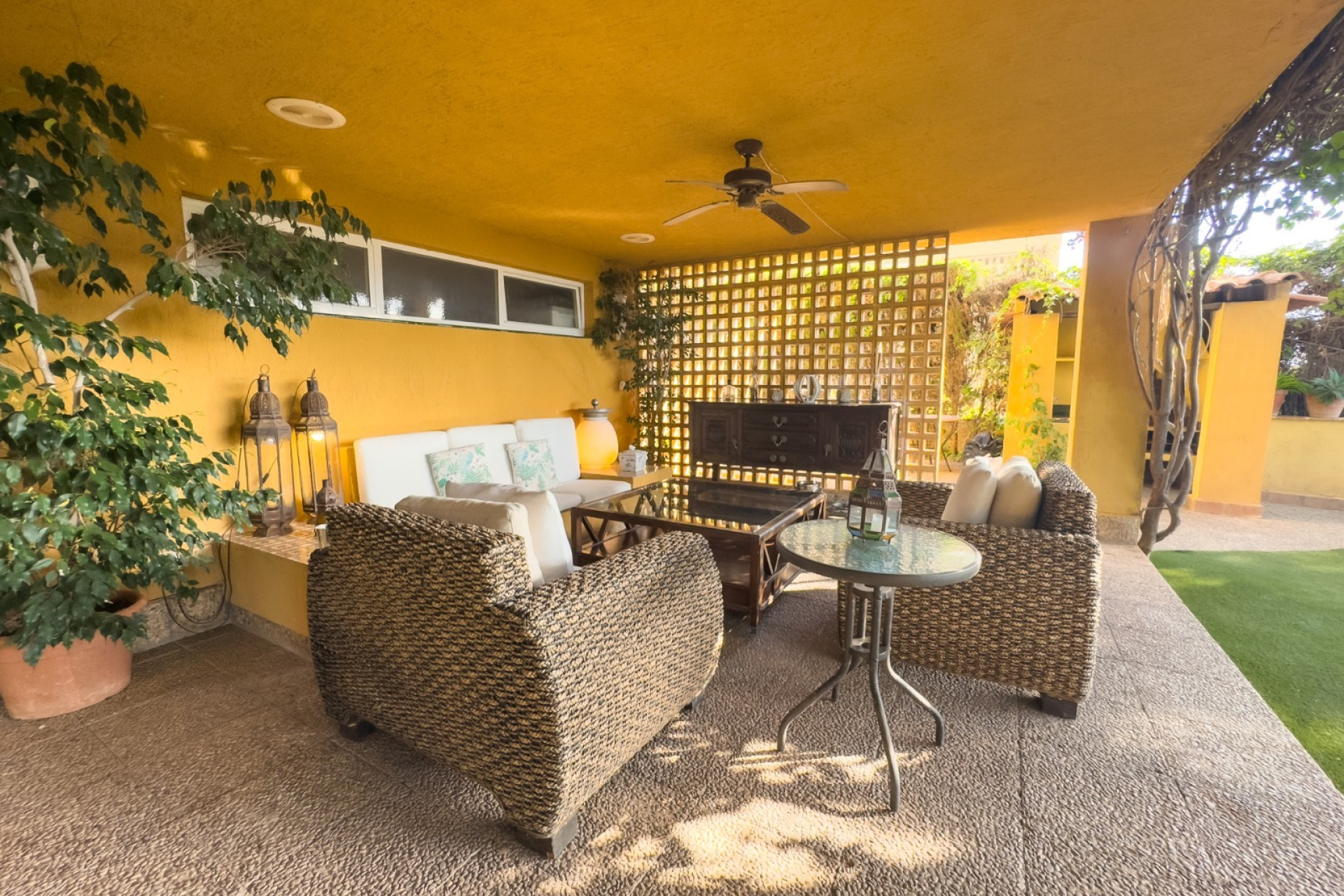 En la zona del jardín tiene un bonito porche con una zona de sofás que conecta mediante unas escaleras exteriores la planta primera.