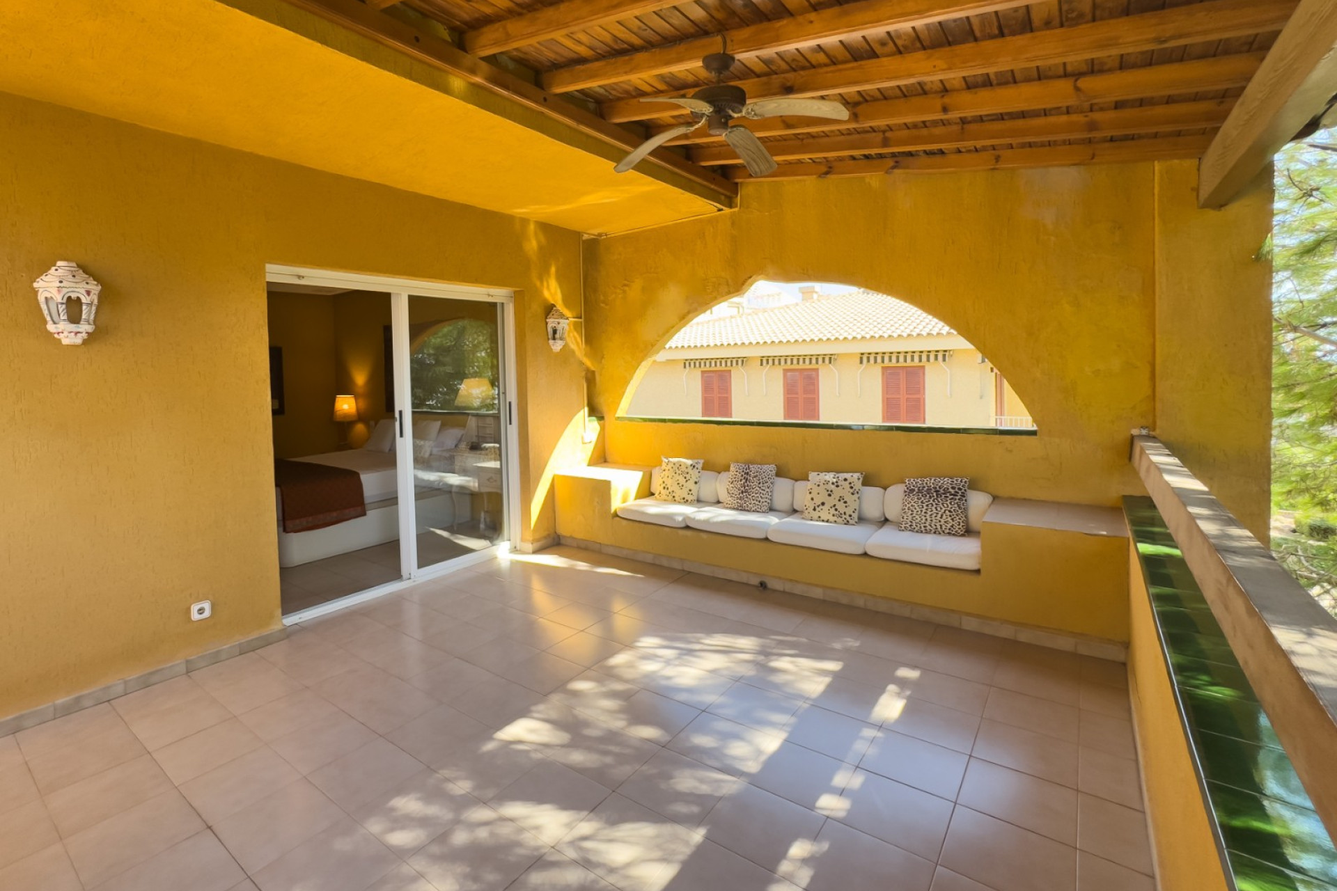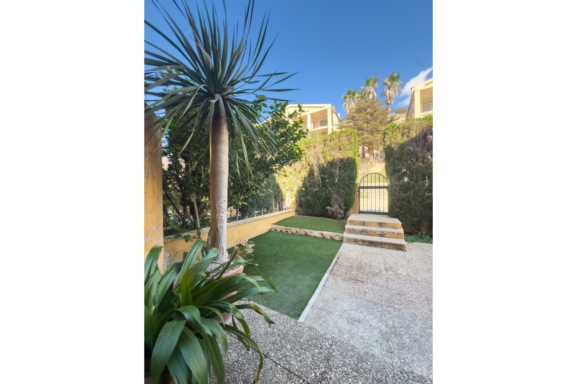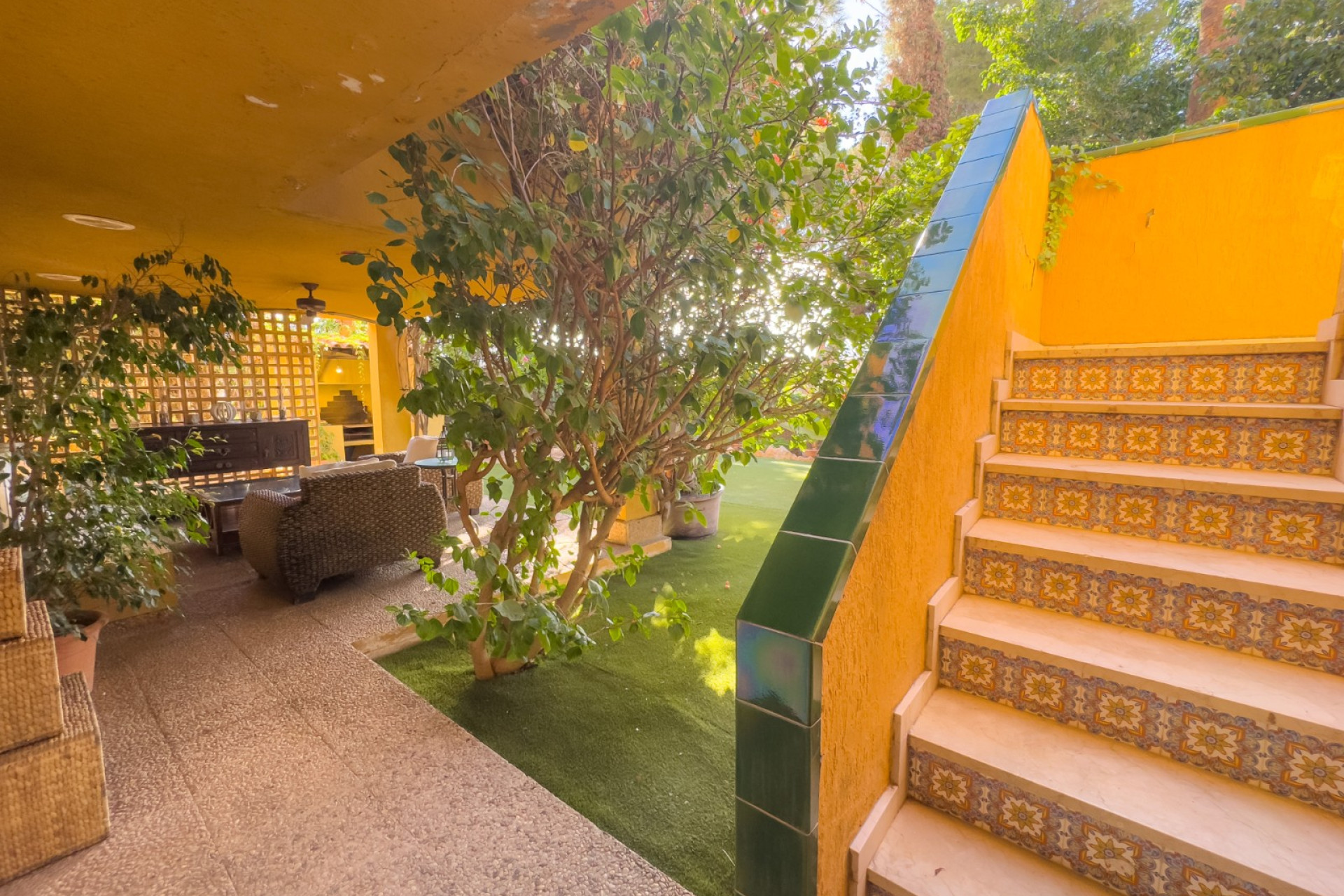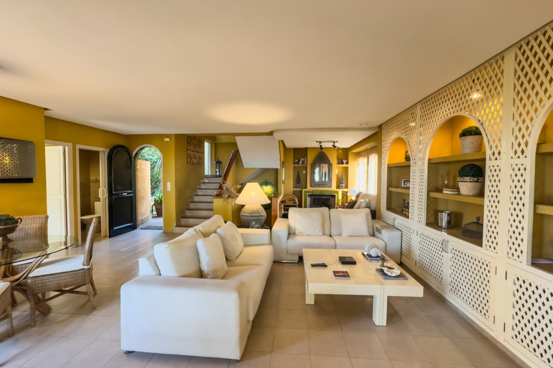 En la zona del jardín tiene un bonito porche con una zona de sofás que conecta mediante unas escaleras exteriores la planta primera.
