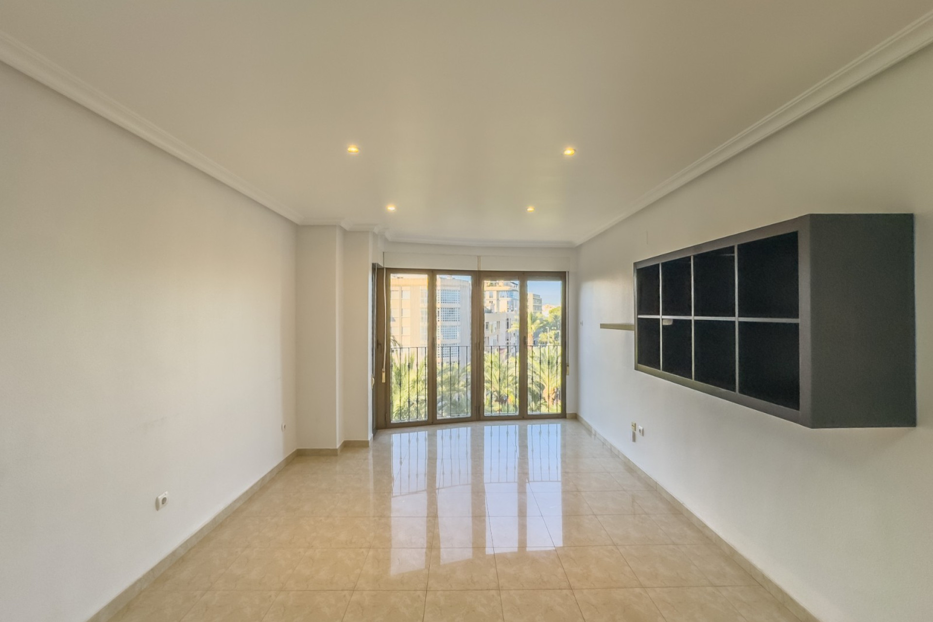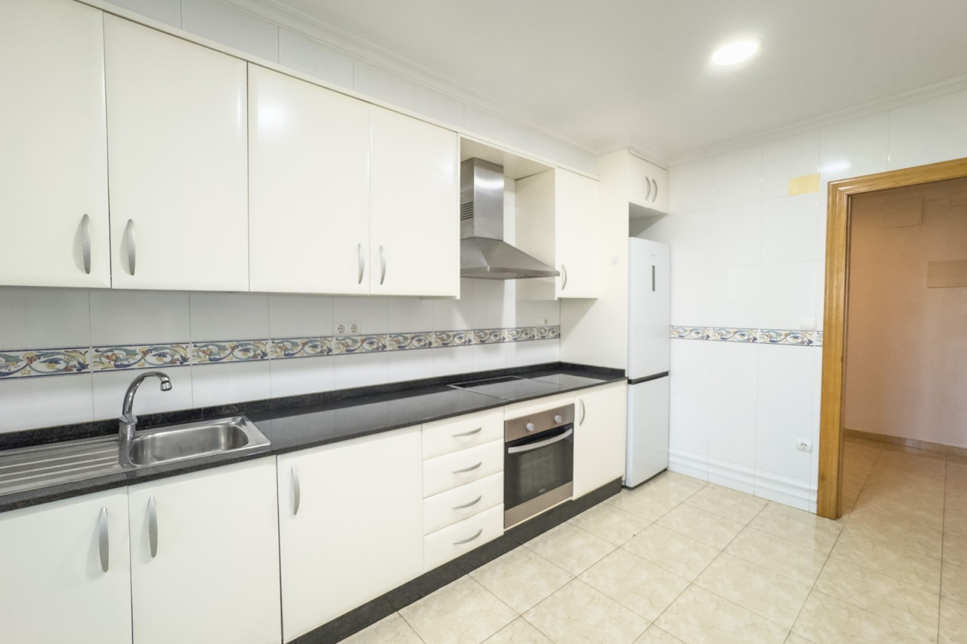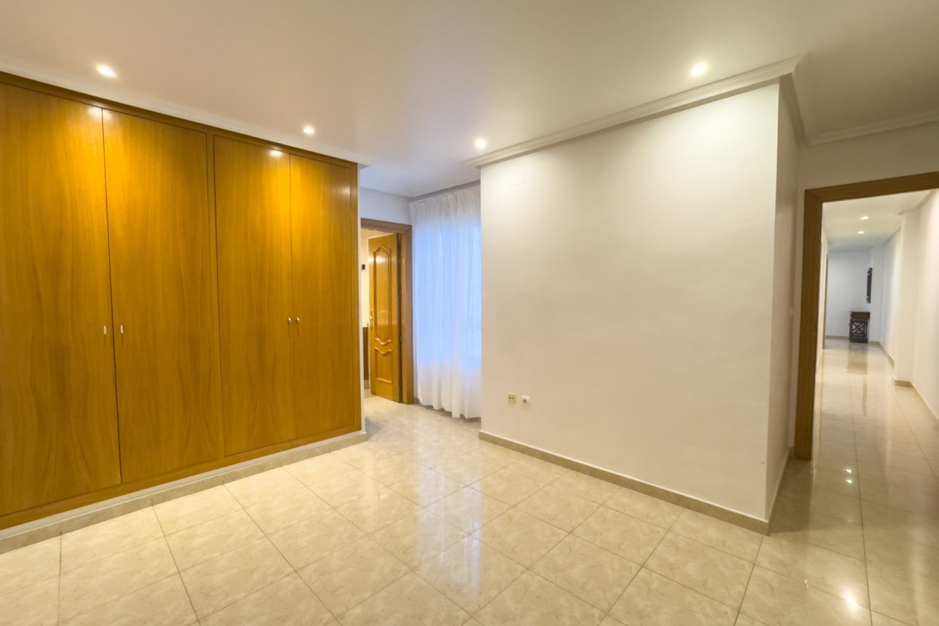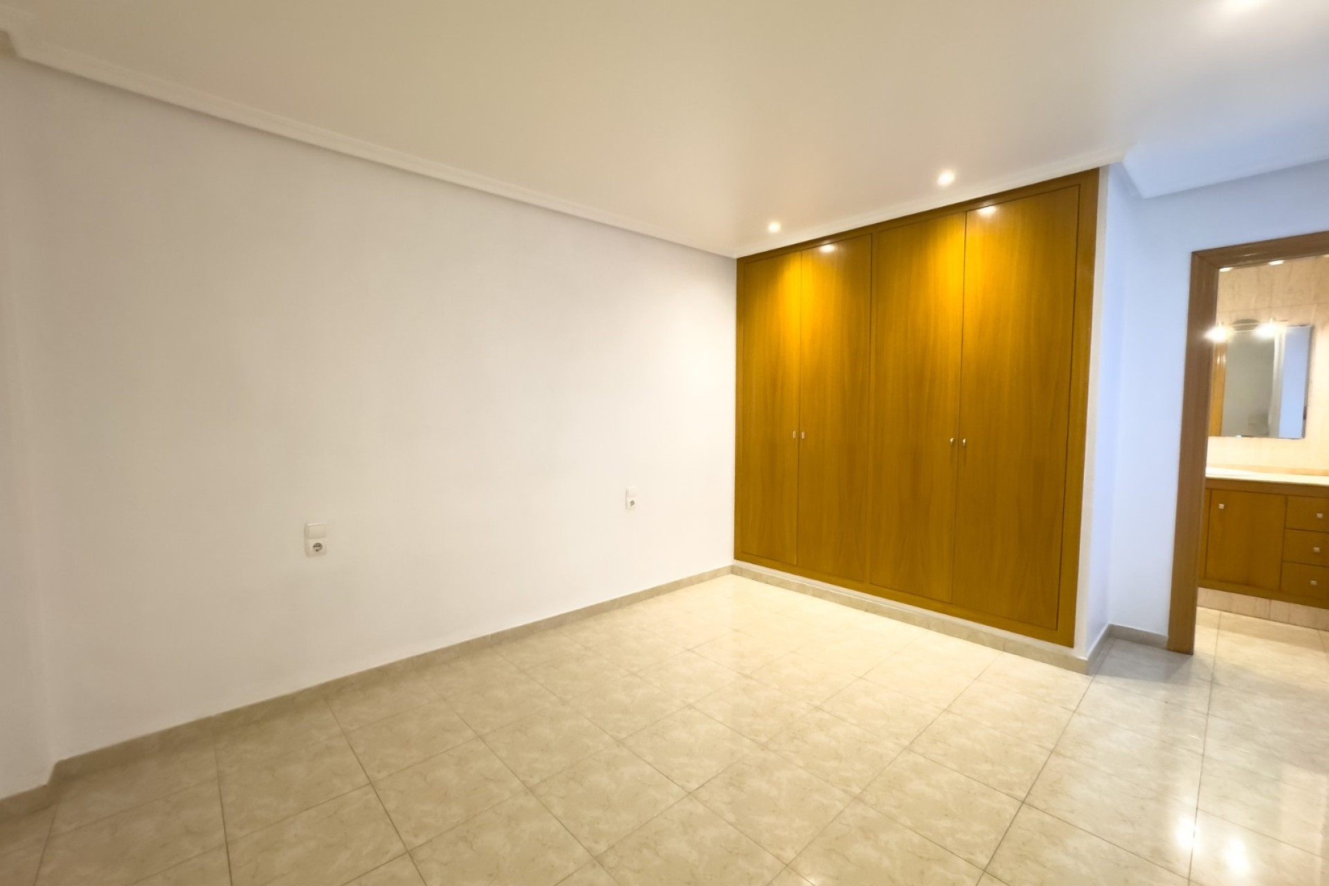 Amplio piso sin amueblar en la Plaza de Benidorm de Elche, cocina y galería equipada con todos los electrodomésticos, la finca cuenta con ascensor, amplias vistas desde el salon y galería-cocina, habitación principal con baño en suite, baño en pasillo, tres amplios armarios de obra en las tres habitaciones.