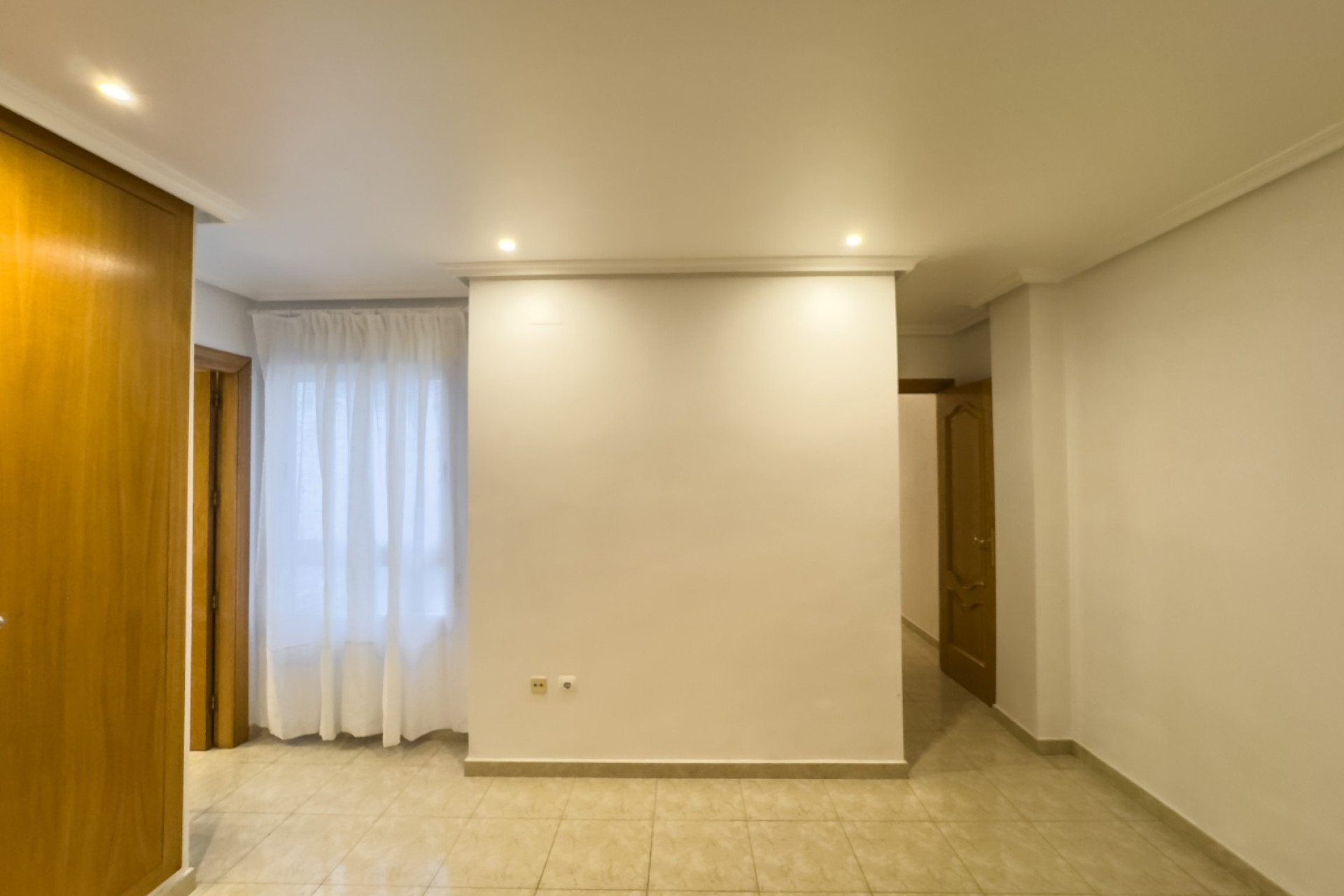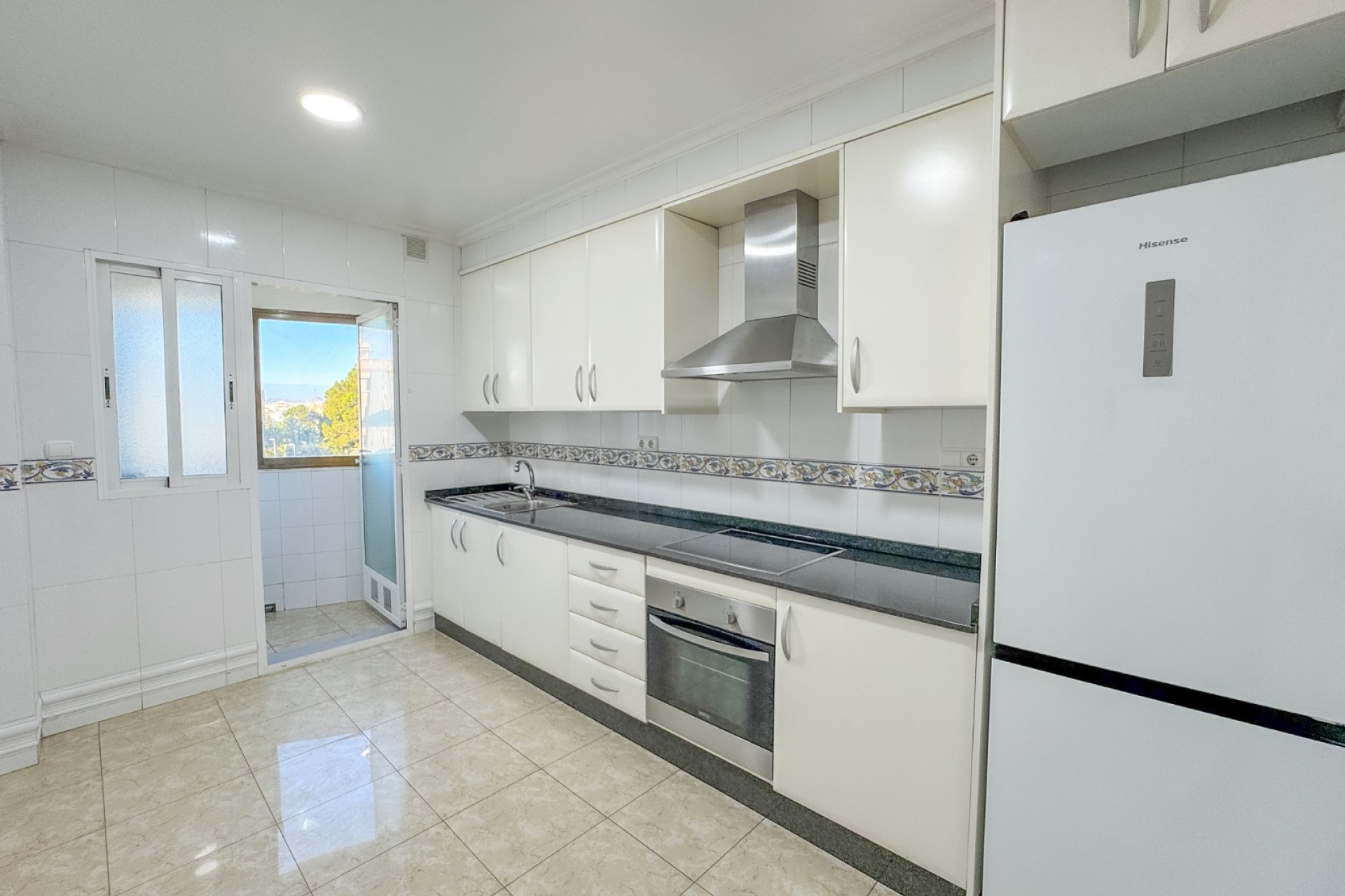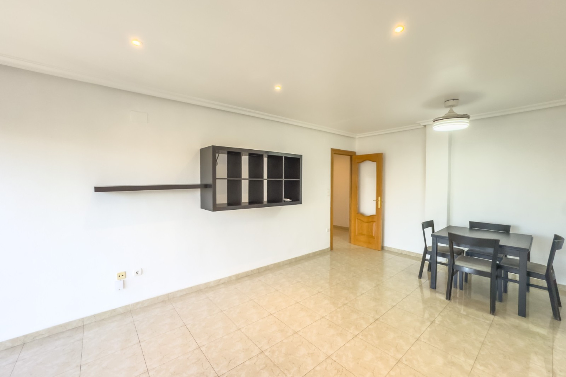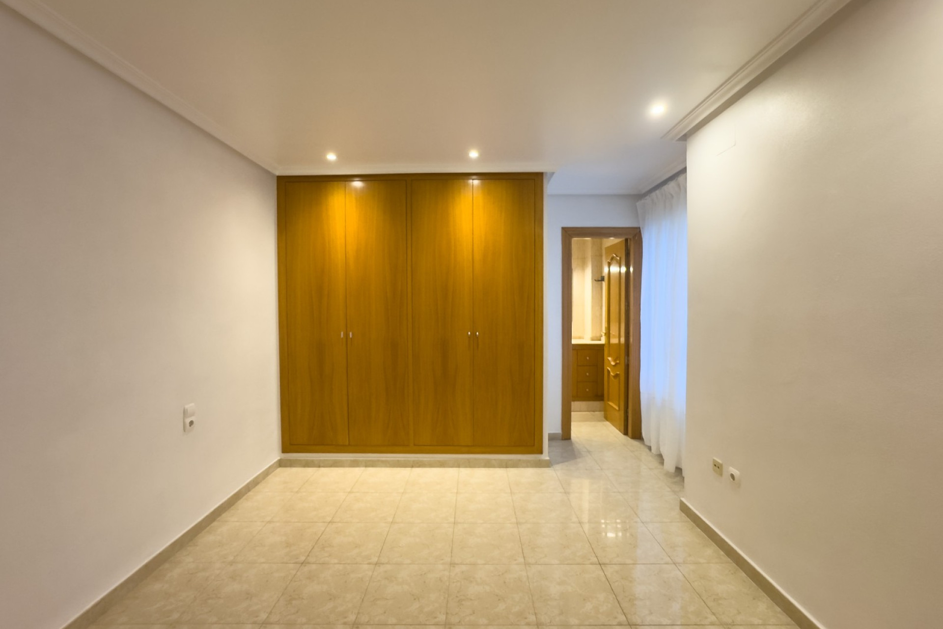 Amplio piso sin amueblar en la Plaza de Benidorm de Elche, cocina y galería equipada con todos los electrodomésticos, la finca cuenta con ascensor, amplias vistas desde el salon y galería-cocina, habitación principal con baño en suite, baño en pasillo, tres amplios armarios de obra en las tres habitaciones.