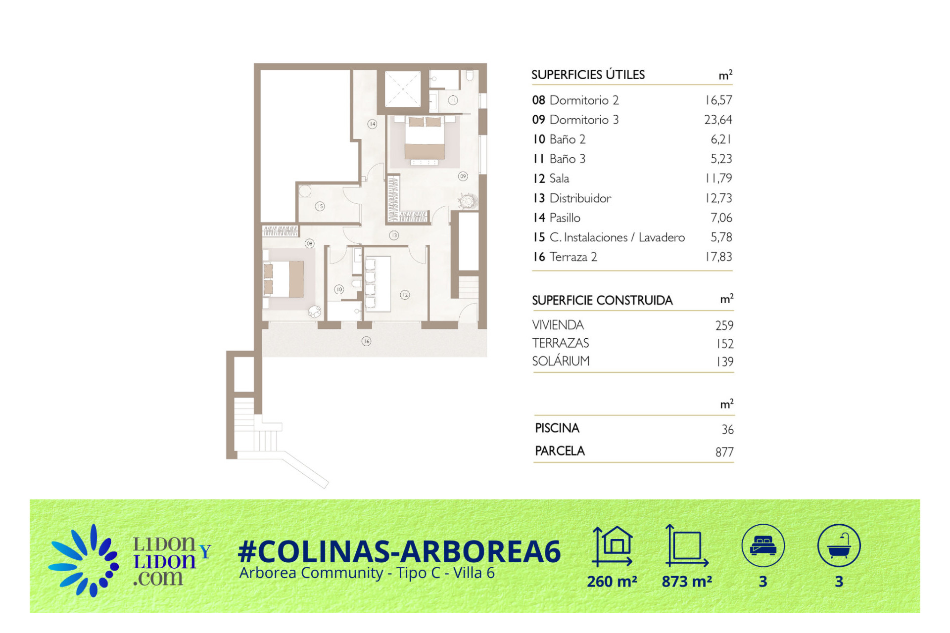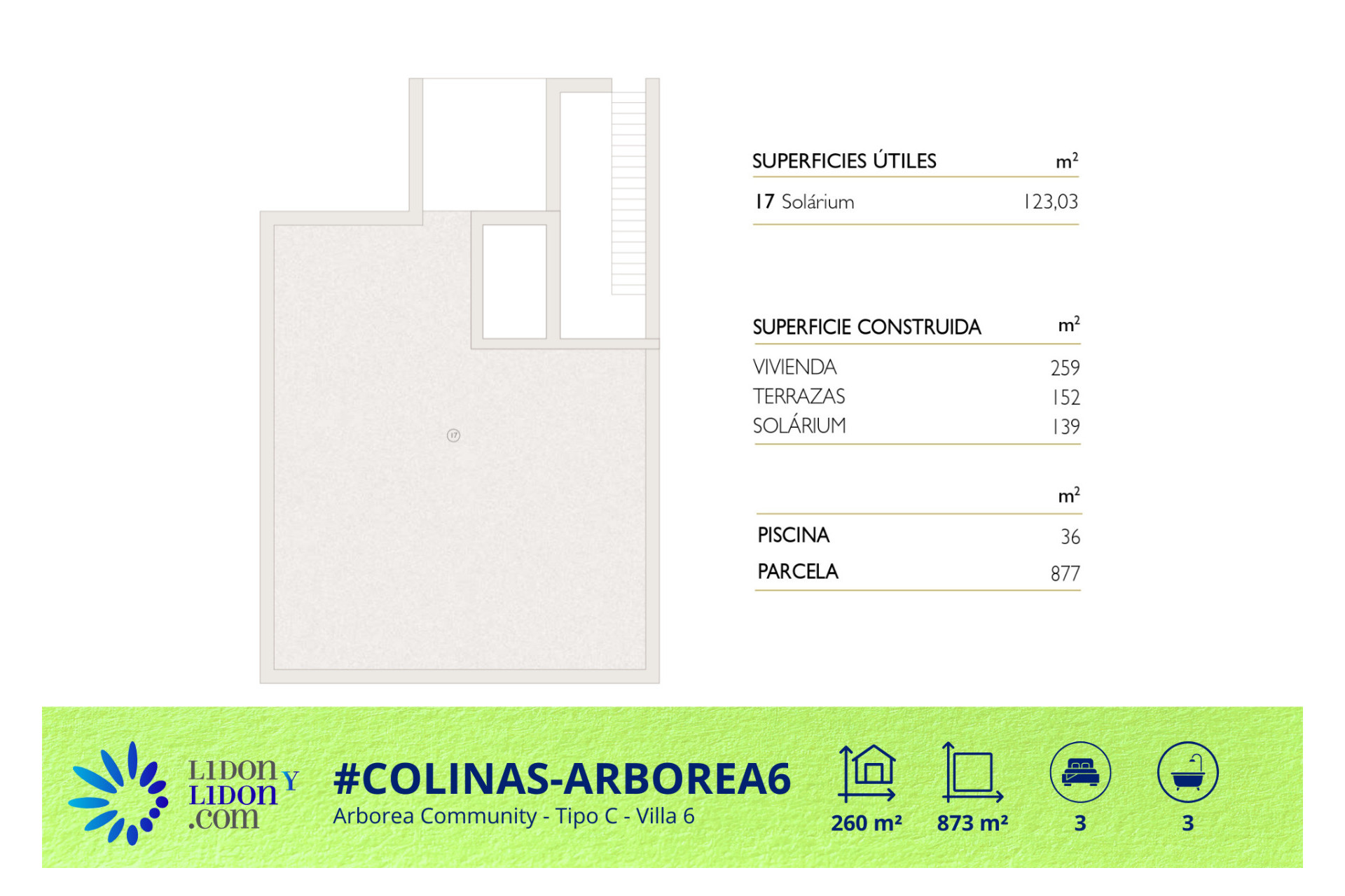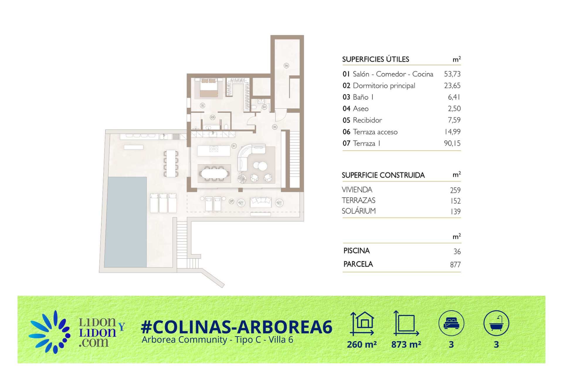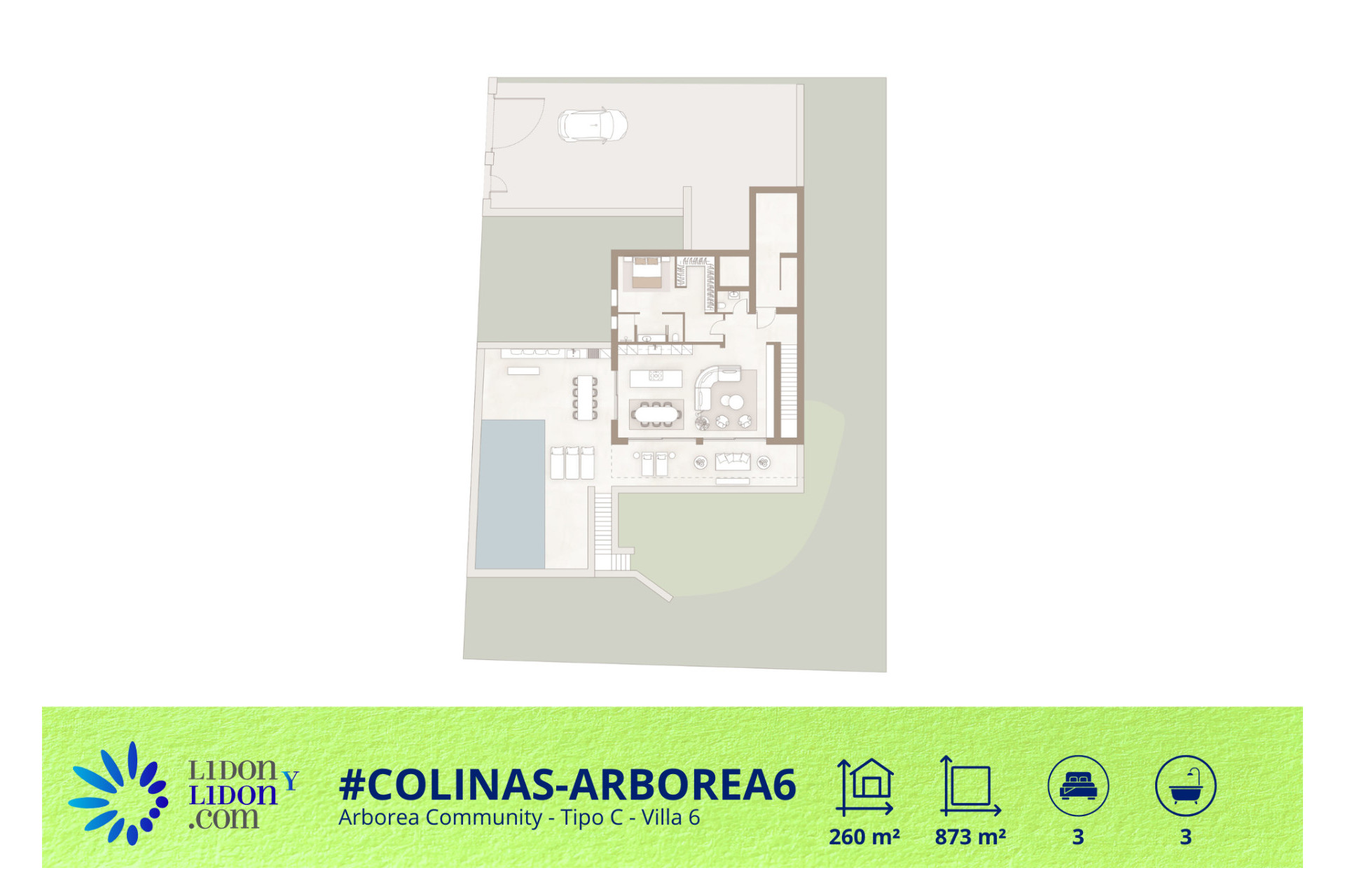 Esta villa de tipología C ofrece una de las distribuciones más amplias y singulares dentro de la colección Arborea en Las Colinas Golf & Country Club. Construida sobre una parcela de 877 m² y con aproximadamente 259 m² construidos, la propiedad dispone de 3 dormitorios, 3 baños, una amplia zona principal de salón, comedor y cocina abierta de más de 53 m², además de excelentes espacios exteriores diseñados para disfrutar plenamente del estilo de vida de la Costa Blanca. La villa cuenta con 152 m² de terrazas, un impresionante solárium de 139 m² y una piscina privada de 36 m², ofreciendo una experiencia exterior excepcional y una conexión natural entre la arquitectura y el entorno. Su distribución ha sido cuidadosamente pensada para combinar confort, privacidad y versatilidad, con amplios volúmenes interiores, zonas de día luminosas y una planta inferior que permite integrar espacios adicionales multifuncionales. Una villa de obra nueva refinada y exclusiva, ideal para compradores que buscan amplias zonas exteriores, acabados premium y un entorno privilegiado dentro de uno de los resorts más prestigiosos del sur de España.