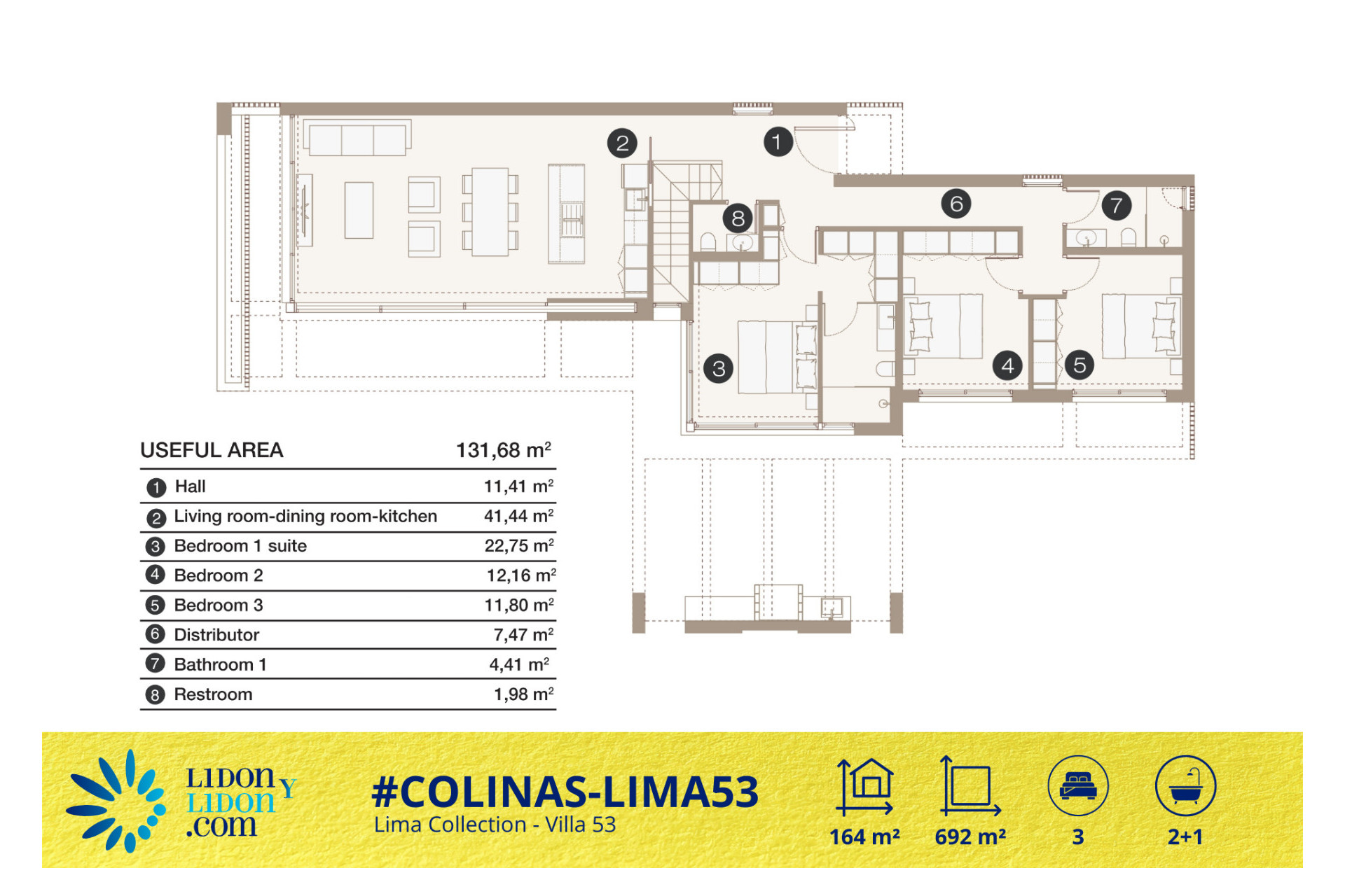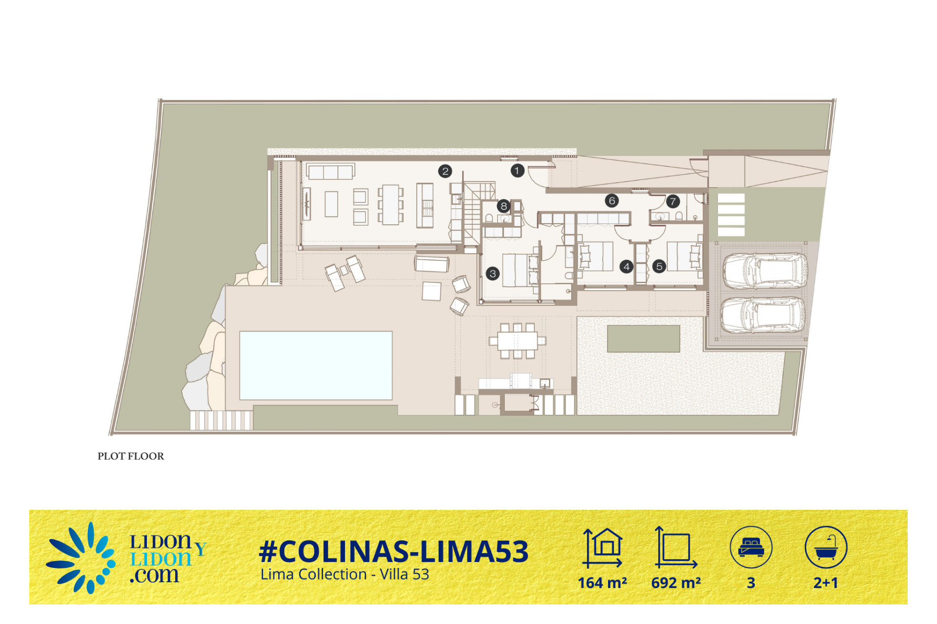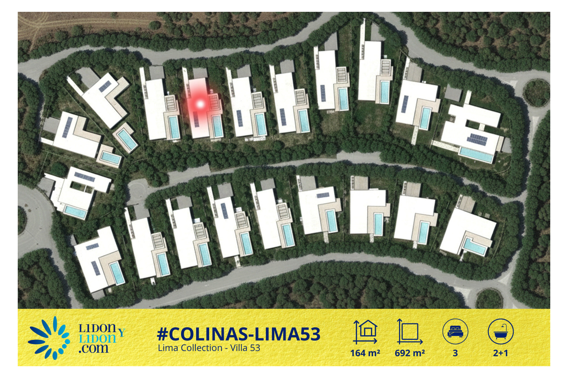 La Villa 53, correspondiente al Tipo 1 de la Lima Collection, se enmarca en un planteamiento contemporáneo en el que la arquitectura prioriza la fluidez, la apertura y la calidad de vida diaria. Ubicada en Las Colinas Golf & Country Club, esta villa en una sola planta disfruta de una implantación cuidada sobre una parcela privada de 692 m², permitiendo organizar de forma armónica los espacios exteriores alrededor de la terraza principal, la piscina privada y las zonas de descanso.
