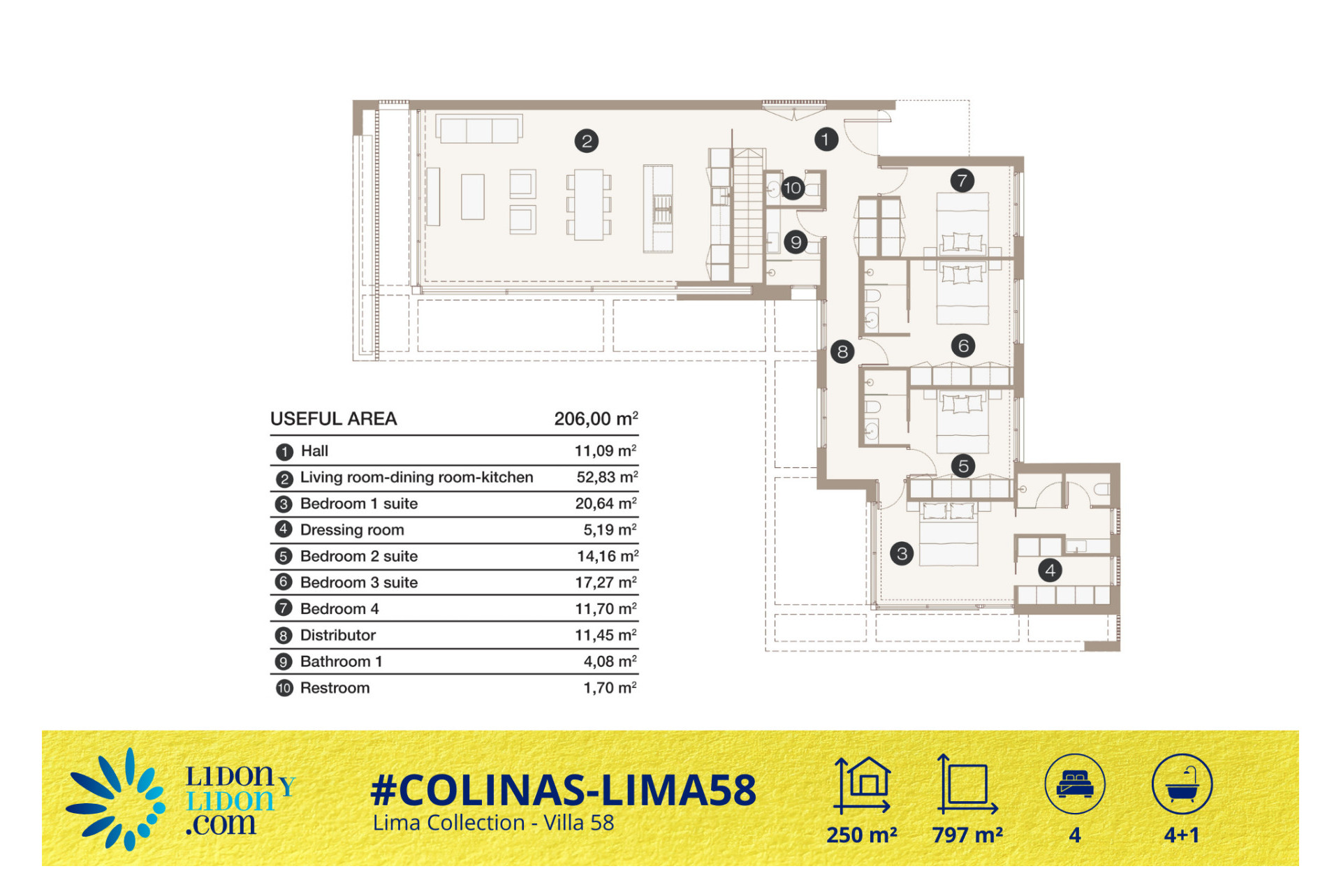 La villa dispone de cuatro dormitorios, de los cuales tres son auténticas suites, ofreciendo un nivel de confort y privacidad especialmente atractivo tanto para residencia habitual como para segunda residencia de alta gama. La distribución interior incorpora una amplia suite principal con vestidor, una circulación equilibrada y funcional, además de cuatro baños completos y un aseo de cortesía. Todo ello conforma una vivienda ideal para disfrutar en familia o recibir invitados con total comodidad.