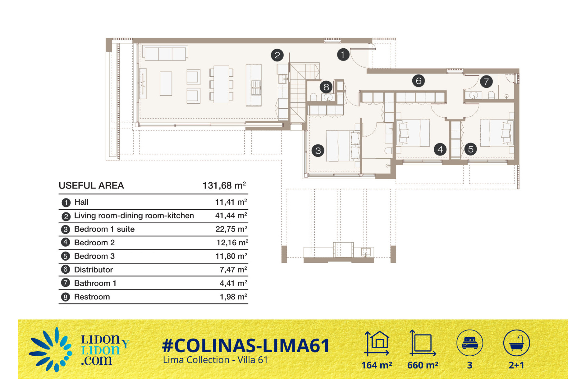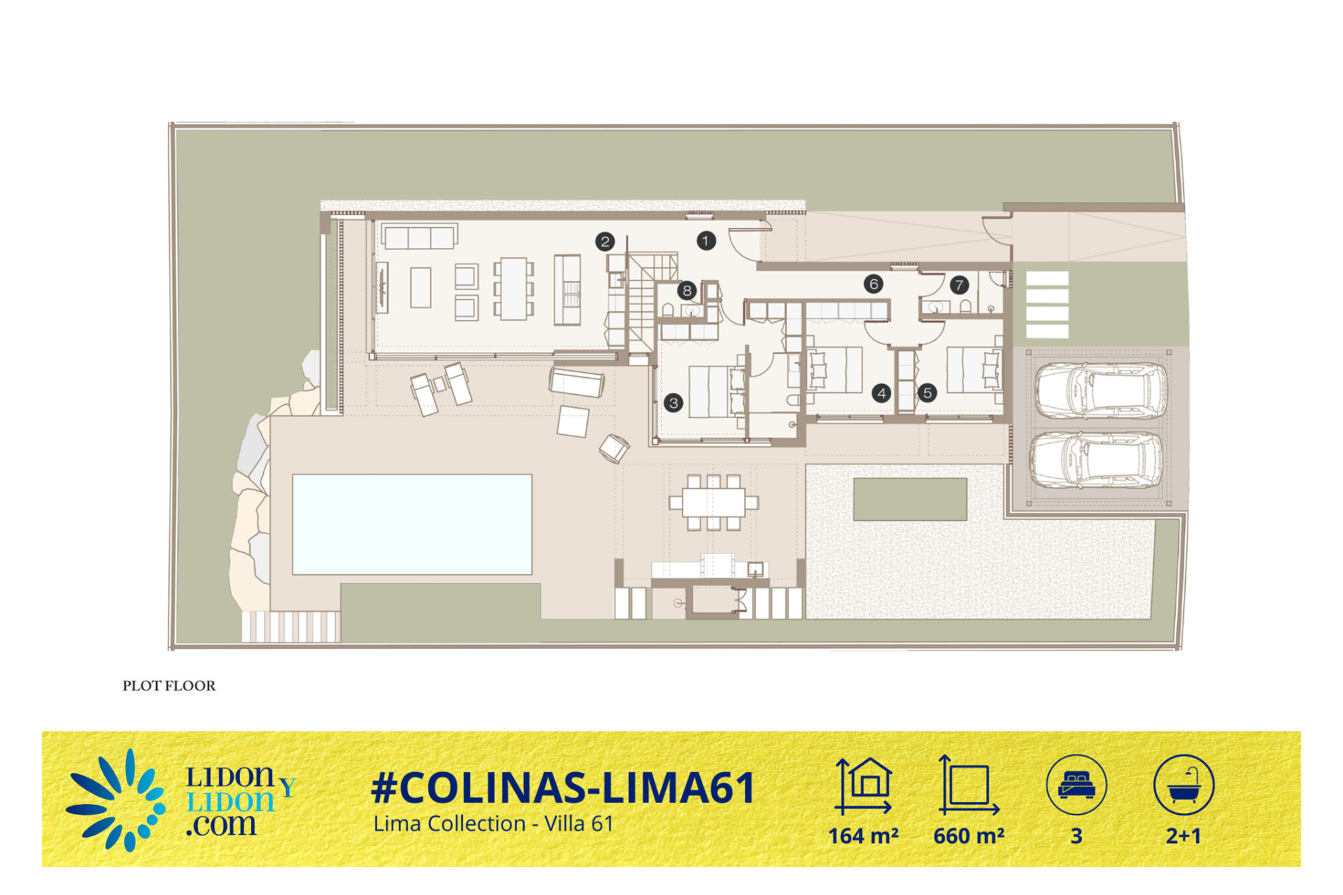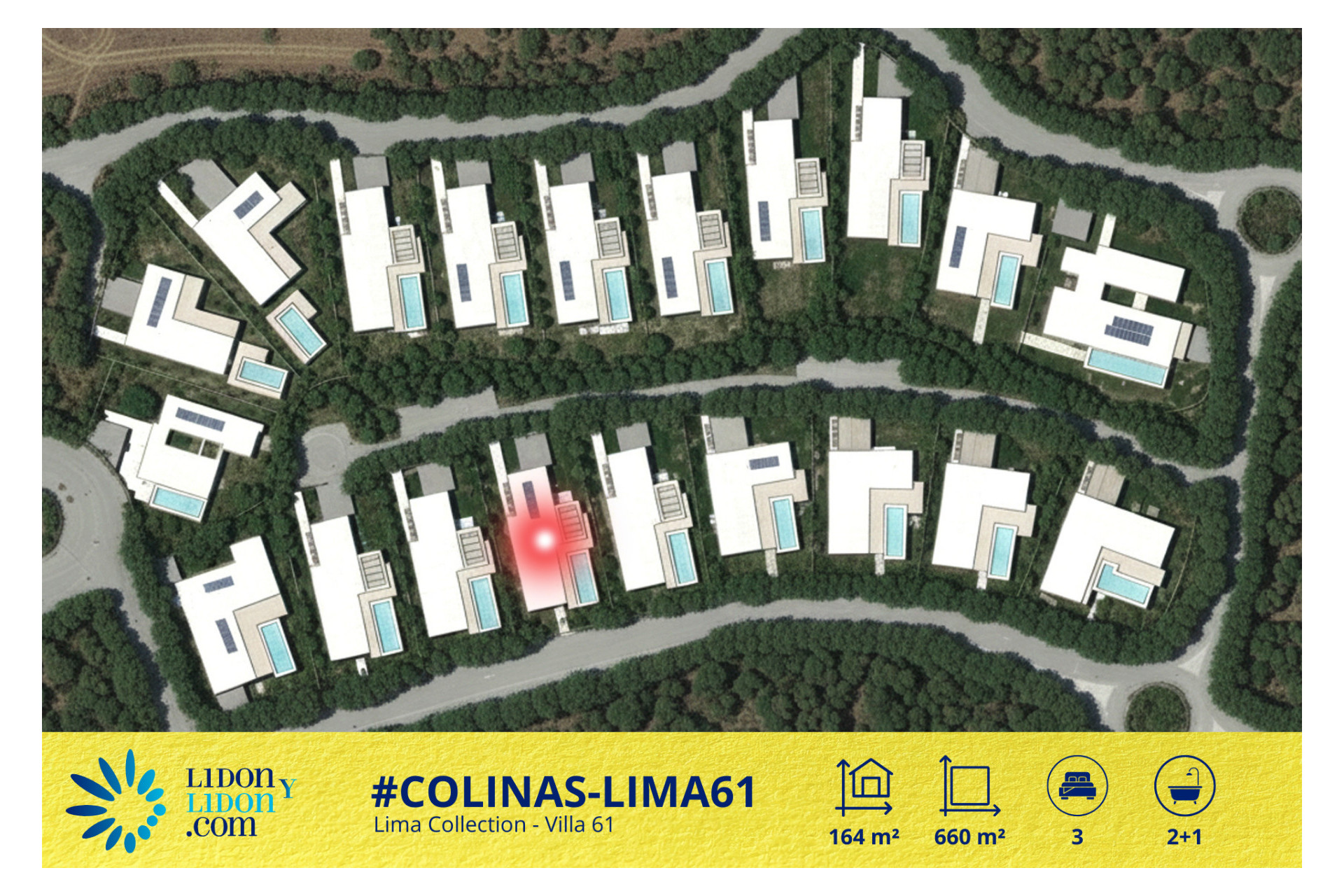 Con sus volúmenes equilibrados, su distribución de tres dormitorios, sus 2 baños + 1 aseo de cortesía, su piscina privada, sus espacios técnicos complementarios y su privilegiada implantación sobre una parcela de 660 m², la Villa Lima 61 representa una magnífica oportunidad para adquirir una villa contemporánea, elegante, funcional y perfectamente integrada en el estilo de vida exclusivo de Las Colinas Golf & Country Club.