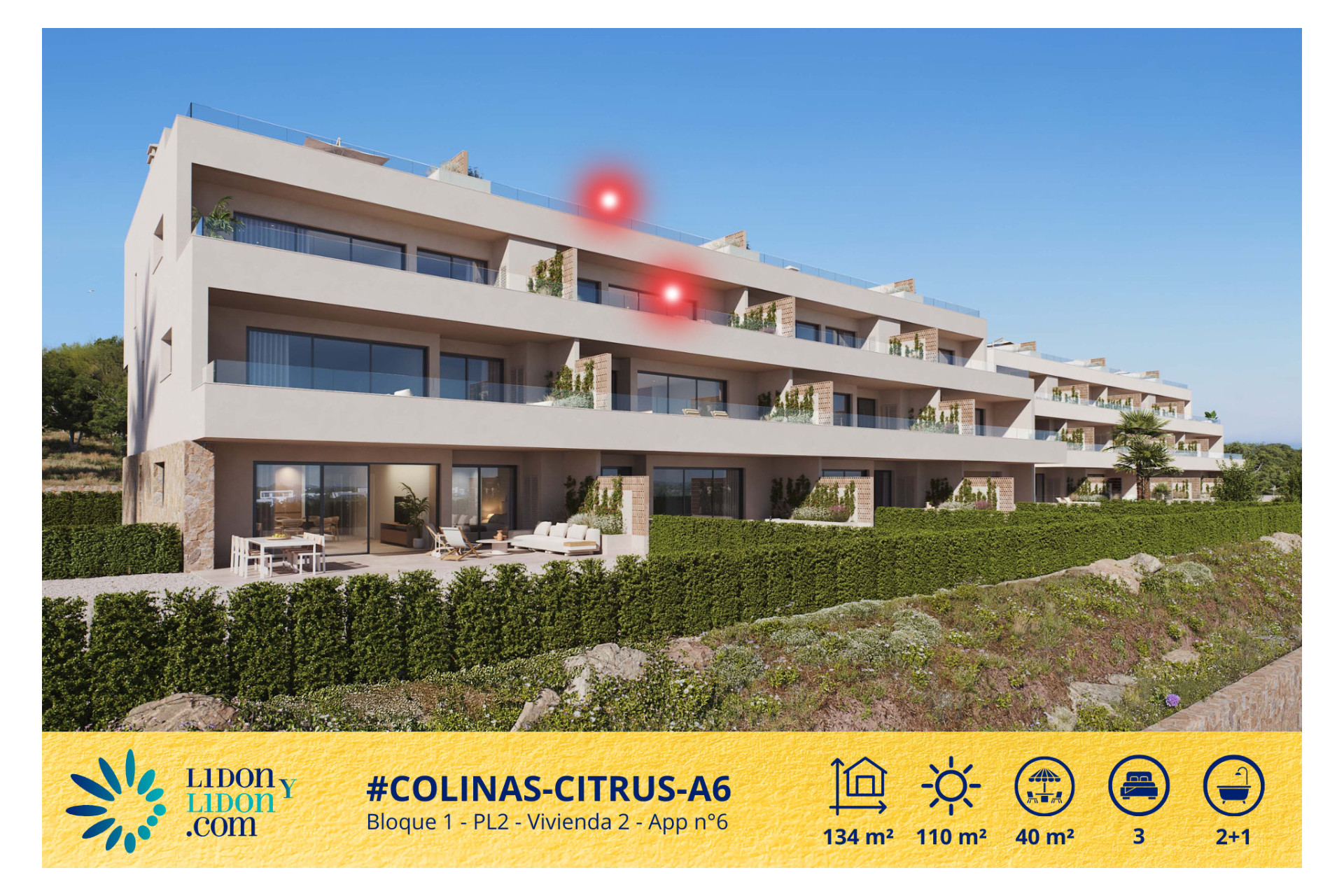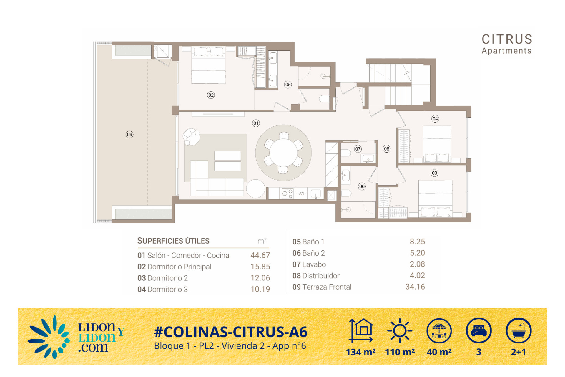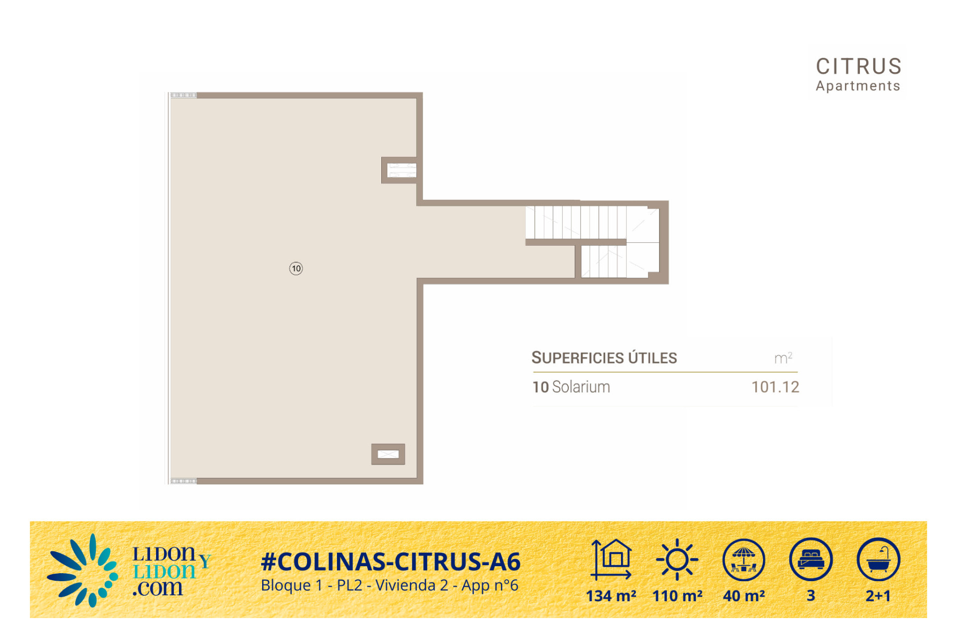 Ubicado en la última planta de la prestigiosa residencia Citrus, dentro del exclusivo entorno de Las Colinas Golf & Country Club, este magnífico ático destaca por su elegancia contemporánea, su distribución especialmente fluida y la calidad excepcional de sus espacios exteriores. Con 134 m² construidos, tres dormitorios, dos baños completos, un aseo de cortesía, una hermosa terraza principal de aproximadamente 34 m² y un espectacular solárium privado de alrededor de 101 m², esta propiedad representa una oportunidad poco habitual para quienes buscan un apartamento de alto nivel con auténtica sensación de villa en altura.