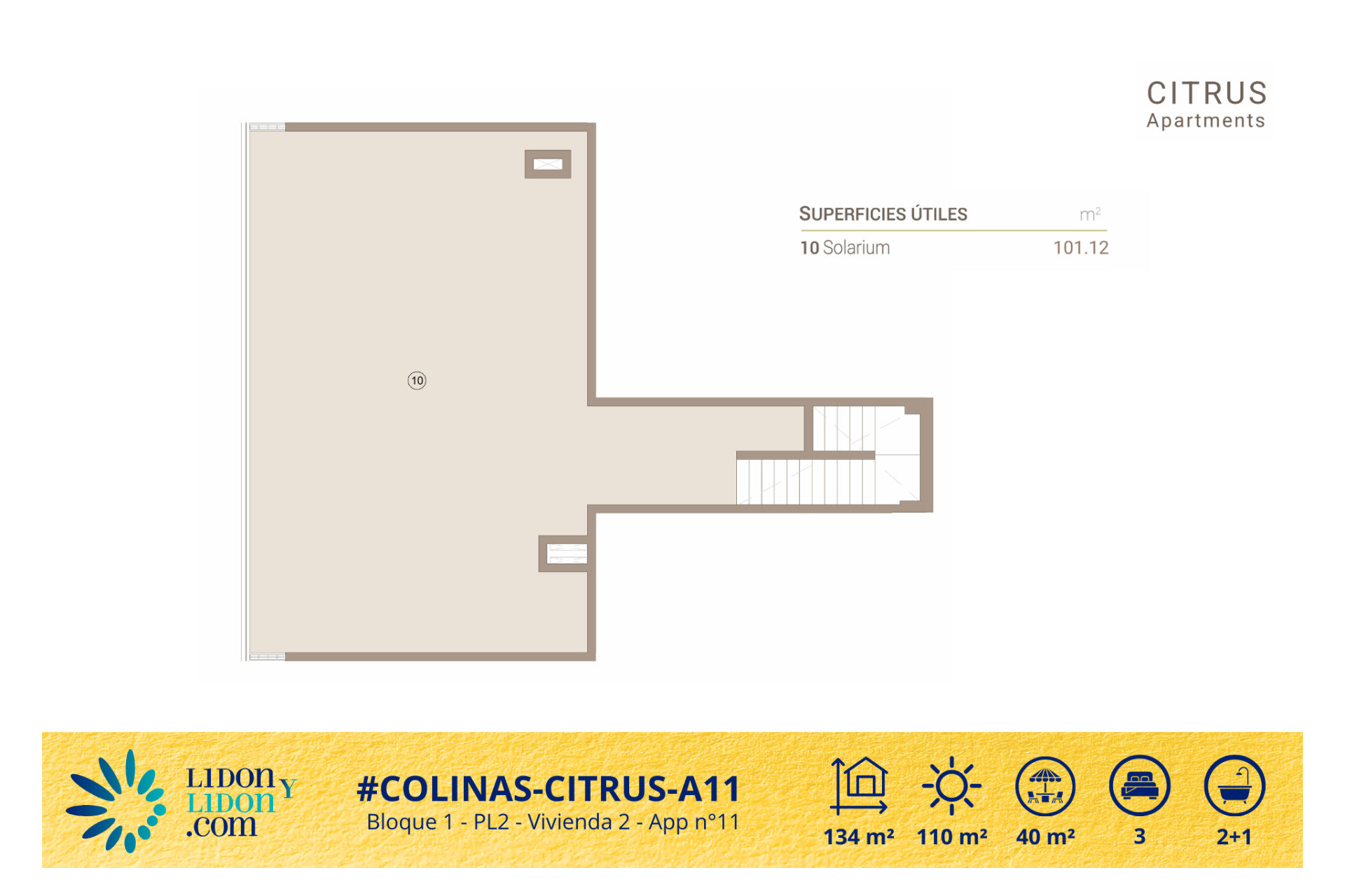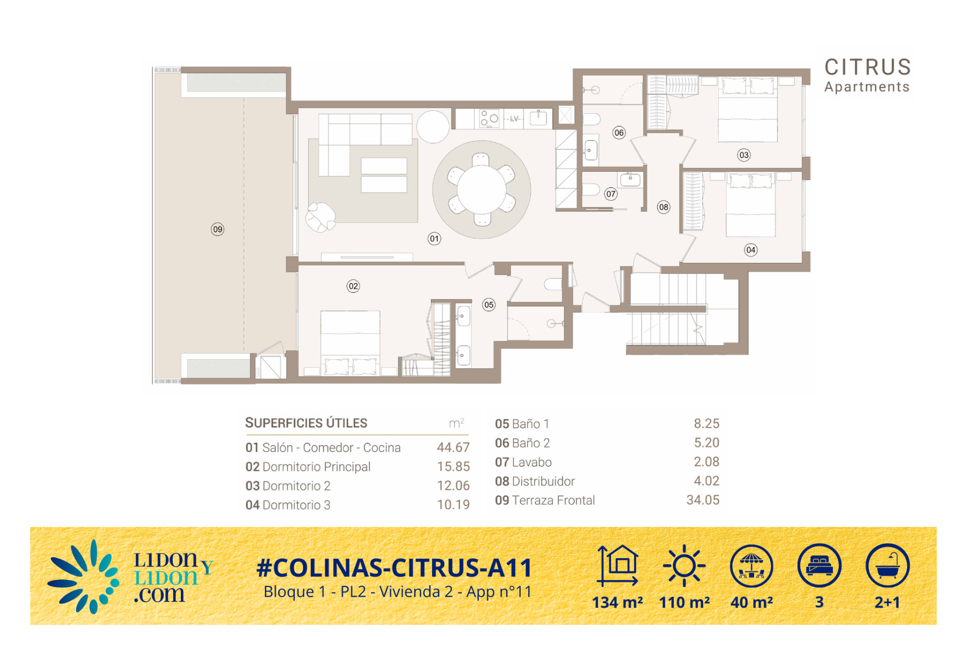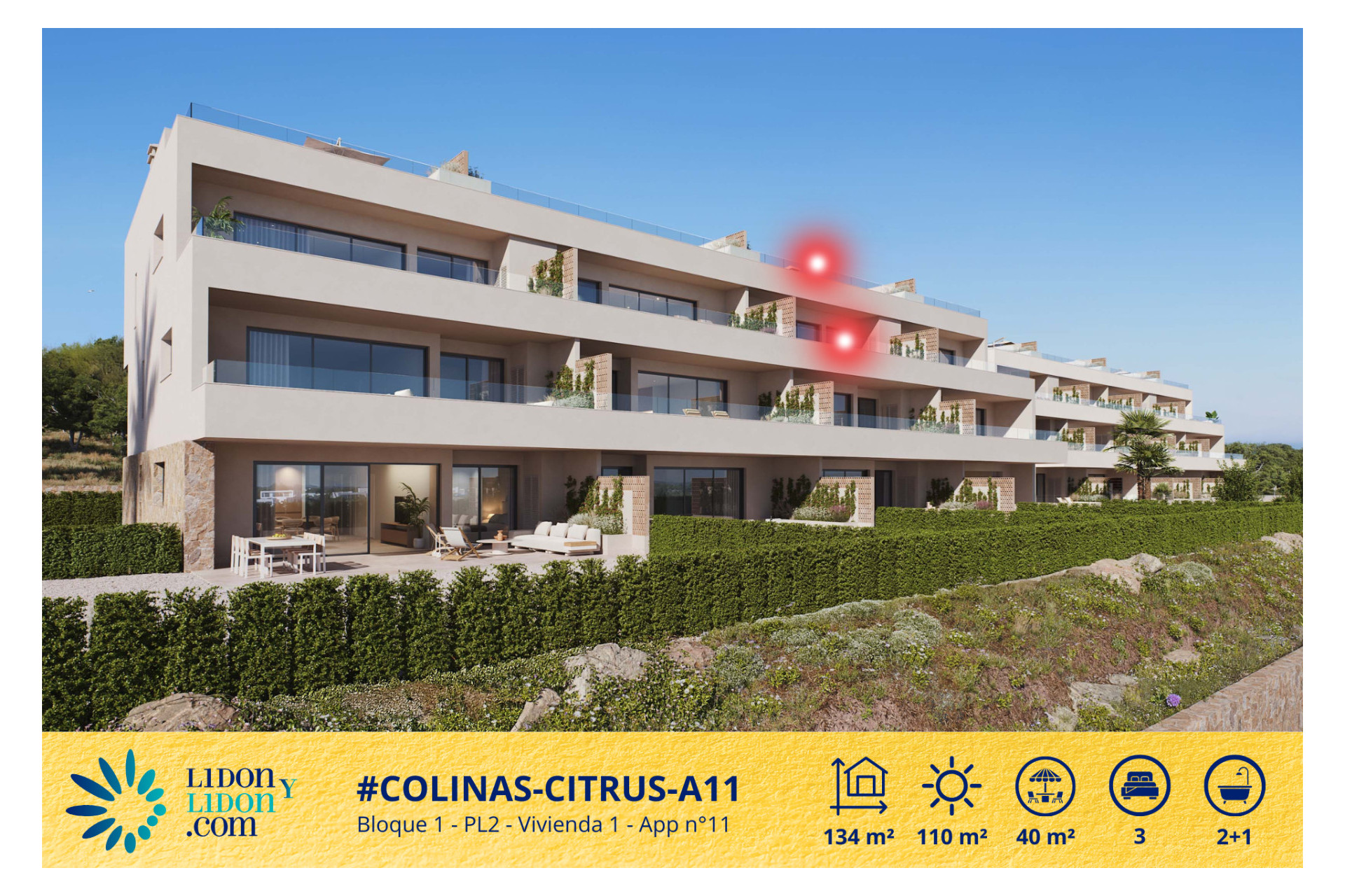 Ubicado en la última planta de la prestigiosa residencia Citrus, dentro del exclusivo entorno de Las Colinas Golf & Country Club, este magnífico ático ofrece un equilibrio perfecto entre elegancia contemporánea, funcionalidad y estilo de vida mediterráneo. Con 134 m² construidos, tres dormitorios, dos baños completos, un aseo de cortesía, una amplia terraza principal de aproximadamente 34 m² y un espectacular solárium privado de alrededor de 101 m², esta propiedad representa una oportunidad poco habitual para quienes buscan una vivienda premium con una gran proyección exterior y auténtica sensación de villa suspendida.