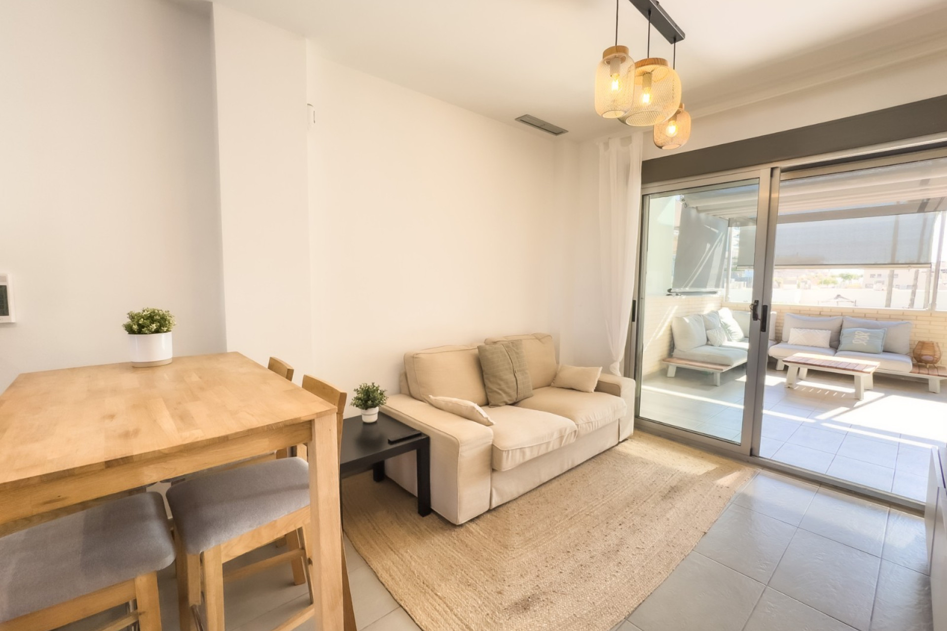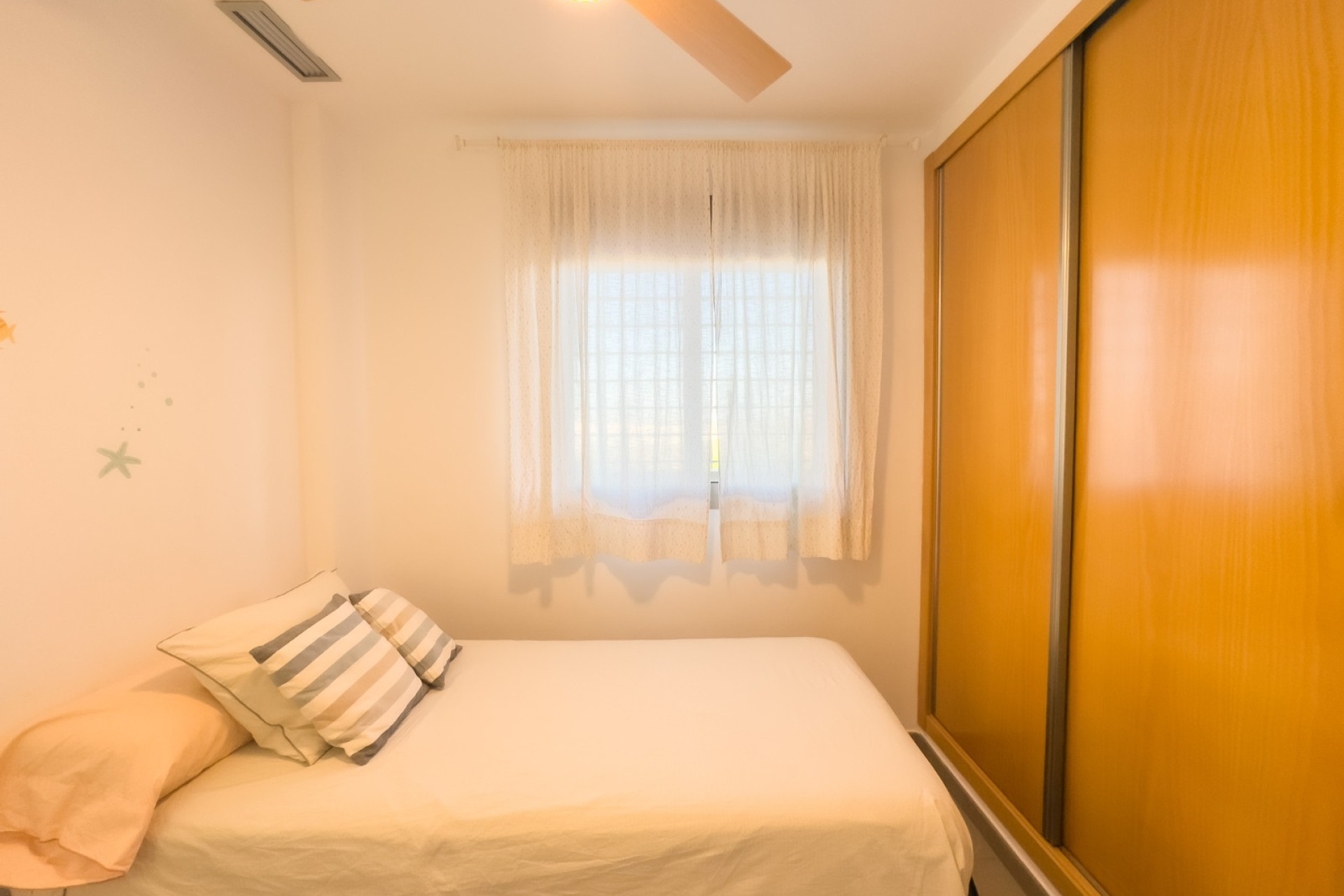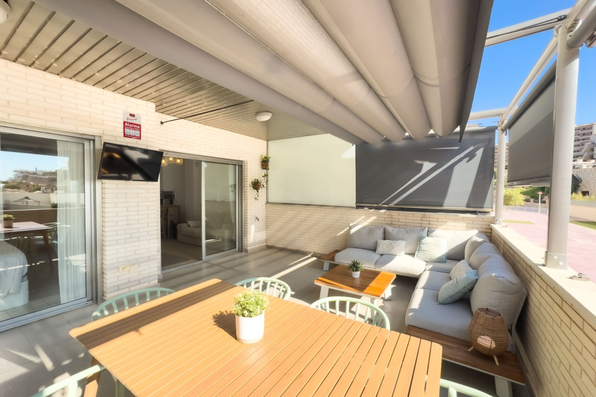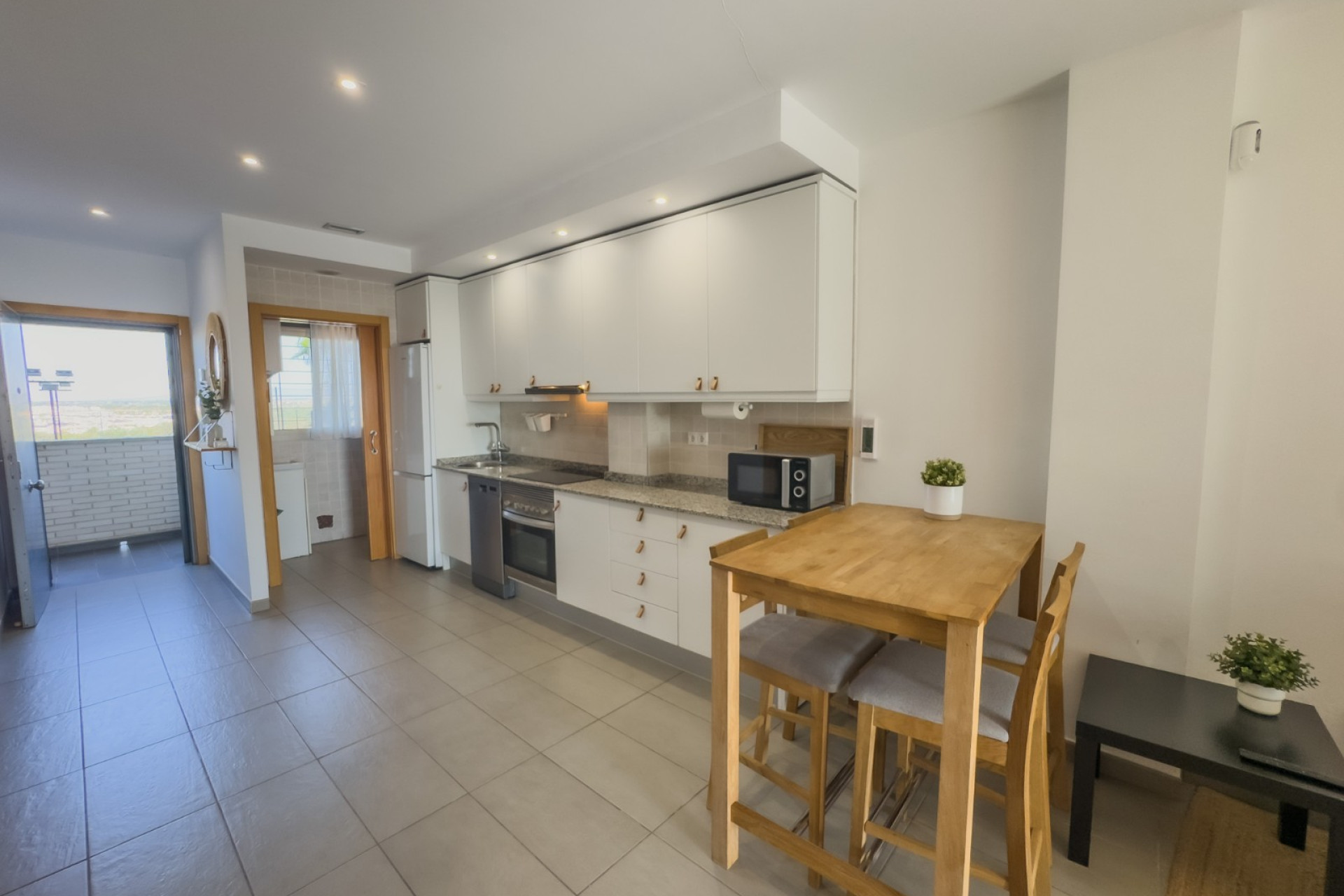 Cozy apartment, very good qualities, fully equipped kitchen with fridge, microwave, induction cooker, electric oven, extractor hood, dishwasher, air conditioning by ducts throughout the house, cold and heat pump, large fitted wardrobes, two bathrooms with shower. East orientation, closed urbanization with elevators, 4 communal swimming pools with landscaped areas, community changing rooms, sports area with padel and football courts.