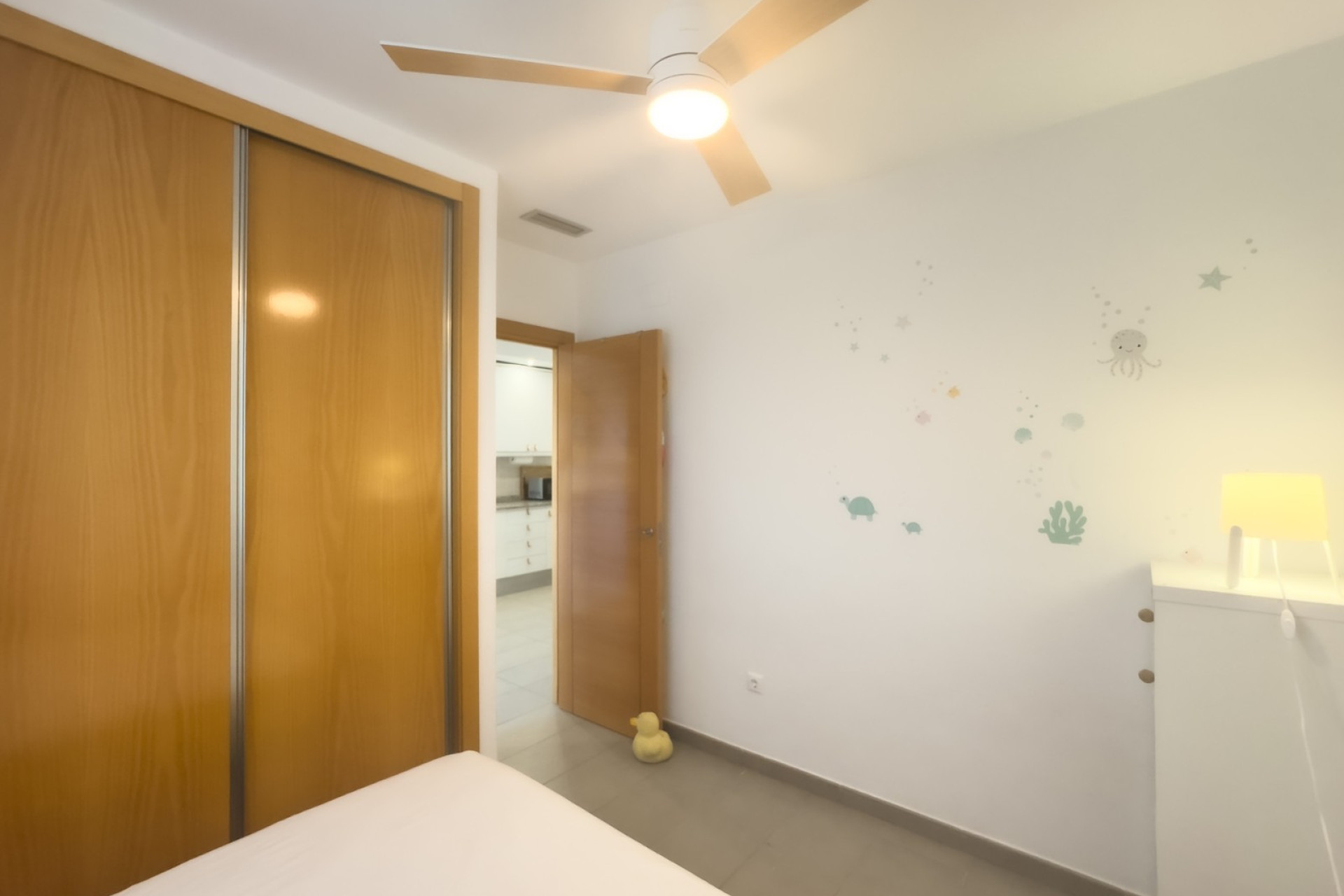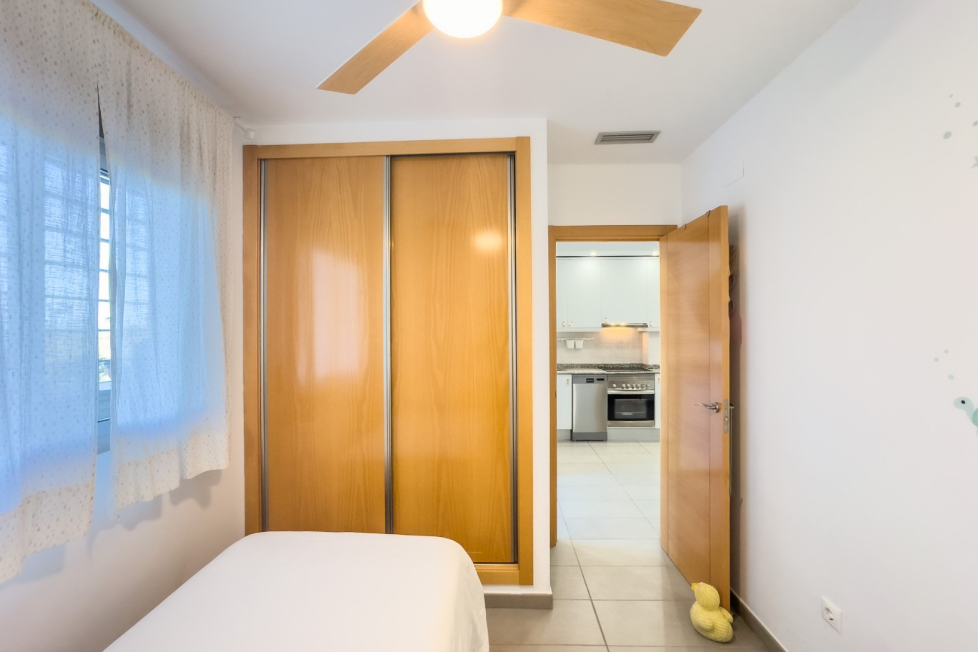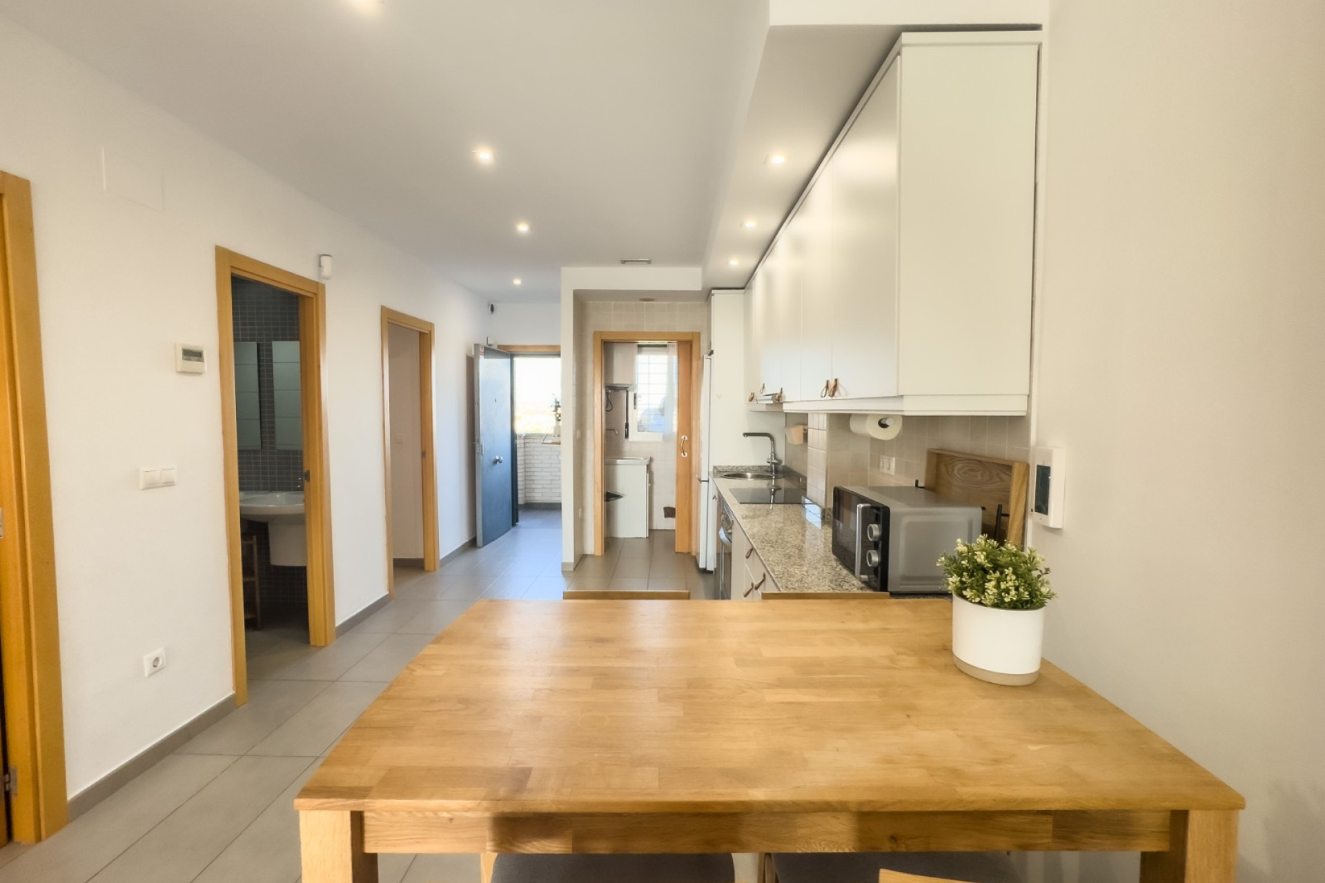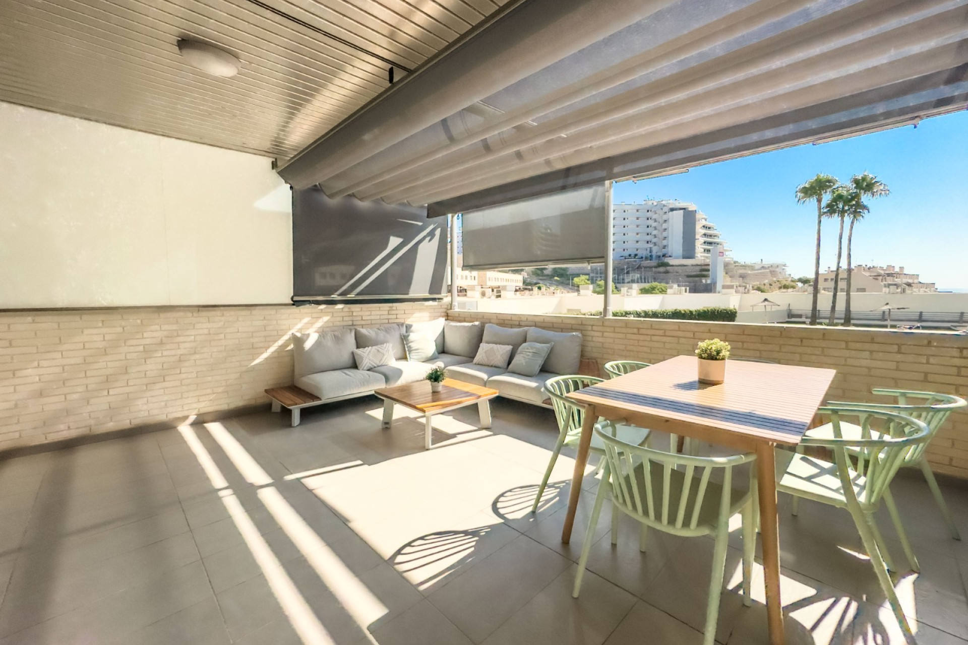 Cozy apartment, very good qualities, fully equipped kitchen with fridge, microwave, induction cooker, electric oven, extractor hood, dishwasher, air conditioning by ducts throughout the house, cold and heat pump, large fitted wardrobes, two bathrooms with shower. East orientation, closed urbanization with elevators, 4 communal swimming pools with landscaped areas, community changing rooms, sports area with padel and football courts.