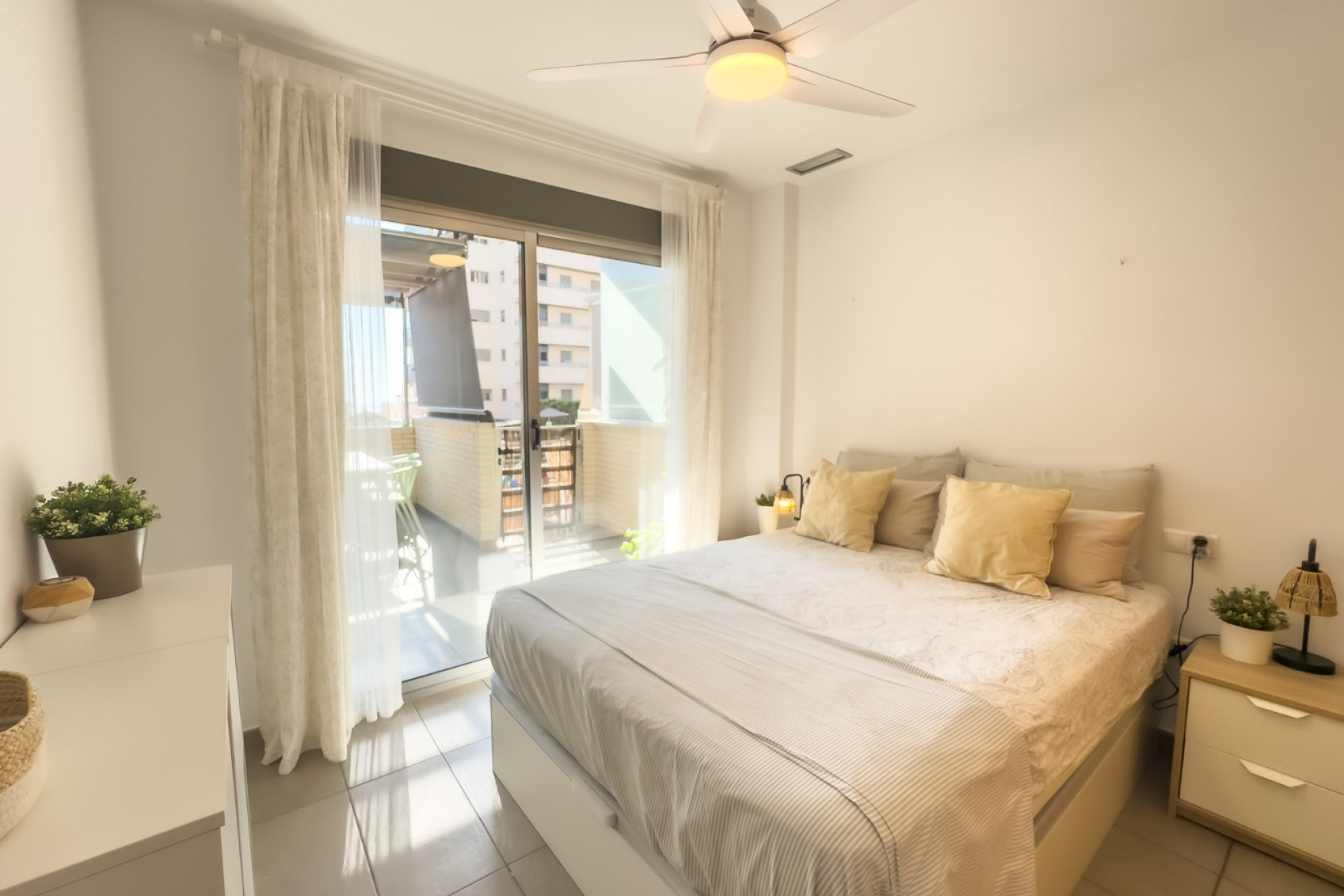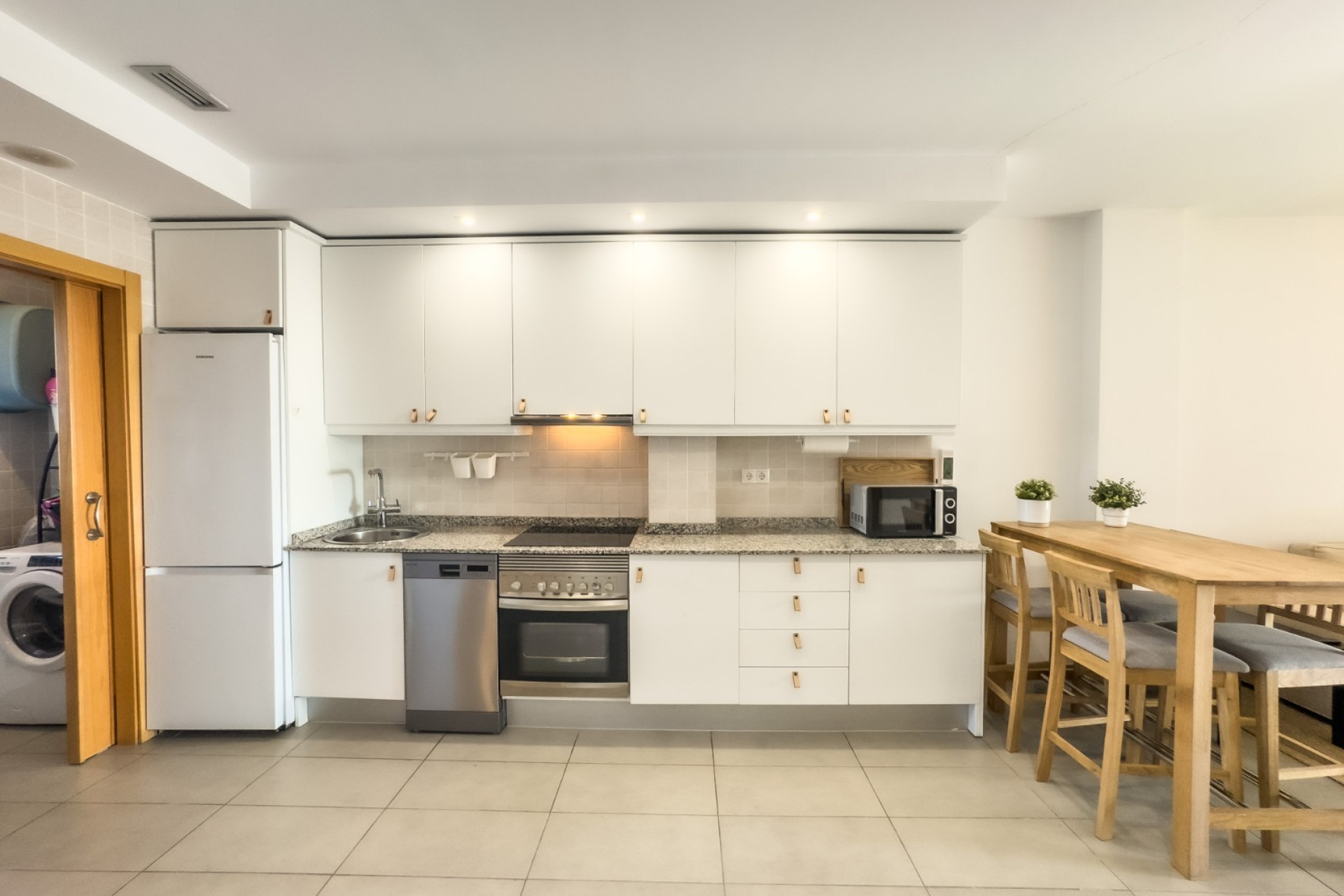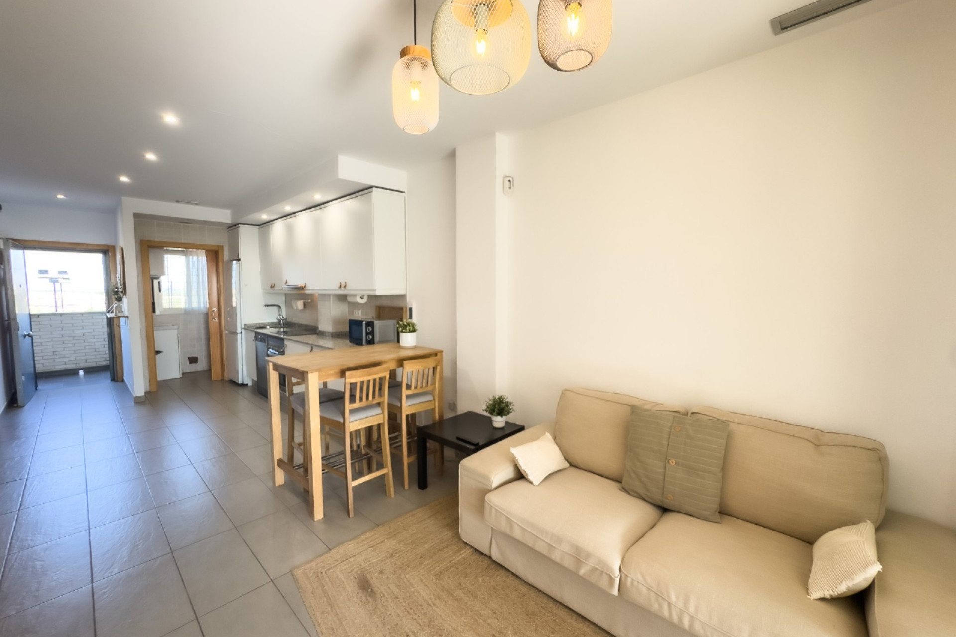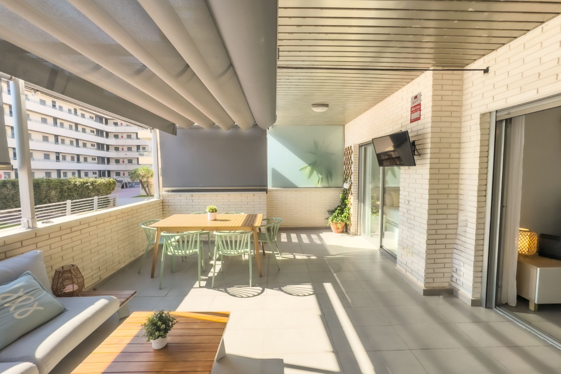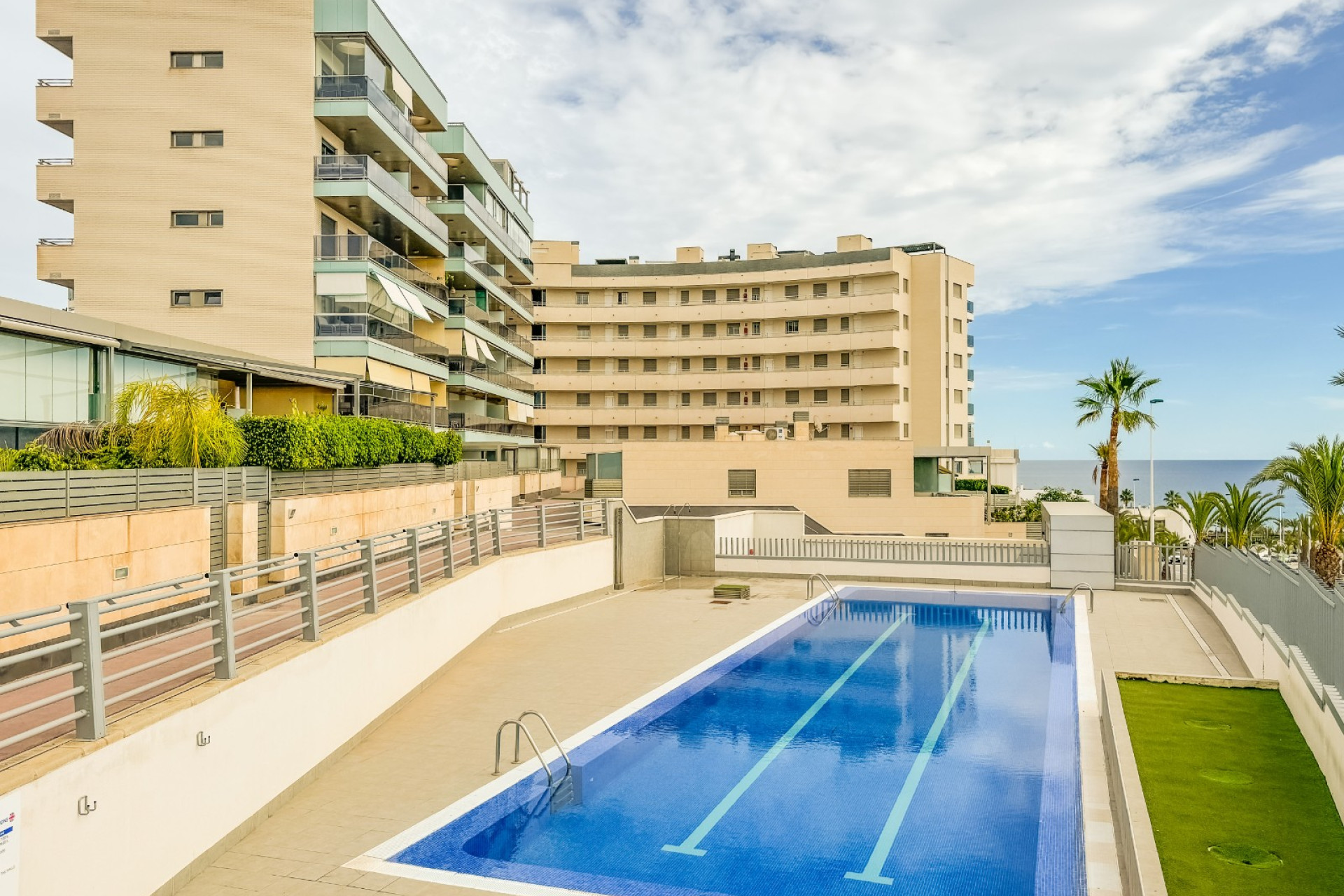 Cozy apartment, very good qualities, fully equipped kitchen with fridge, microwave, induction cooker, electric oven, extractor hood, dishwasher, air conditioning by ducts throughout the house, cold and heat pump, large fitted wardrobes, two bathrooms with shower. East orientation, closed urbanization with elevators, 4 communal swimming pools with landscaped areas, community changing rooms, sports area with padel and football courts.
