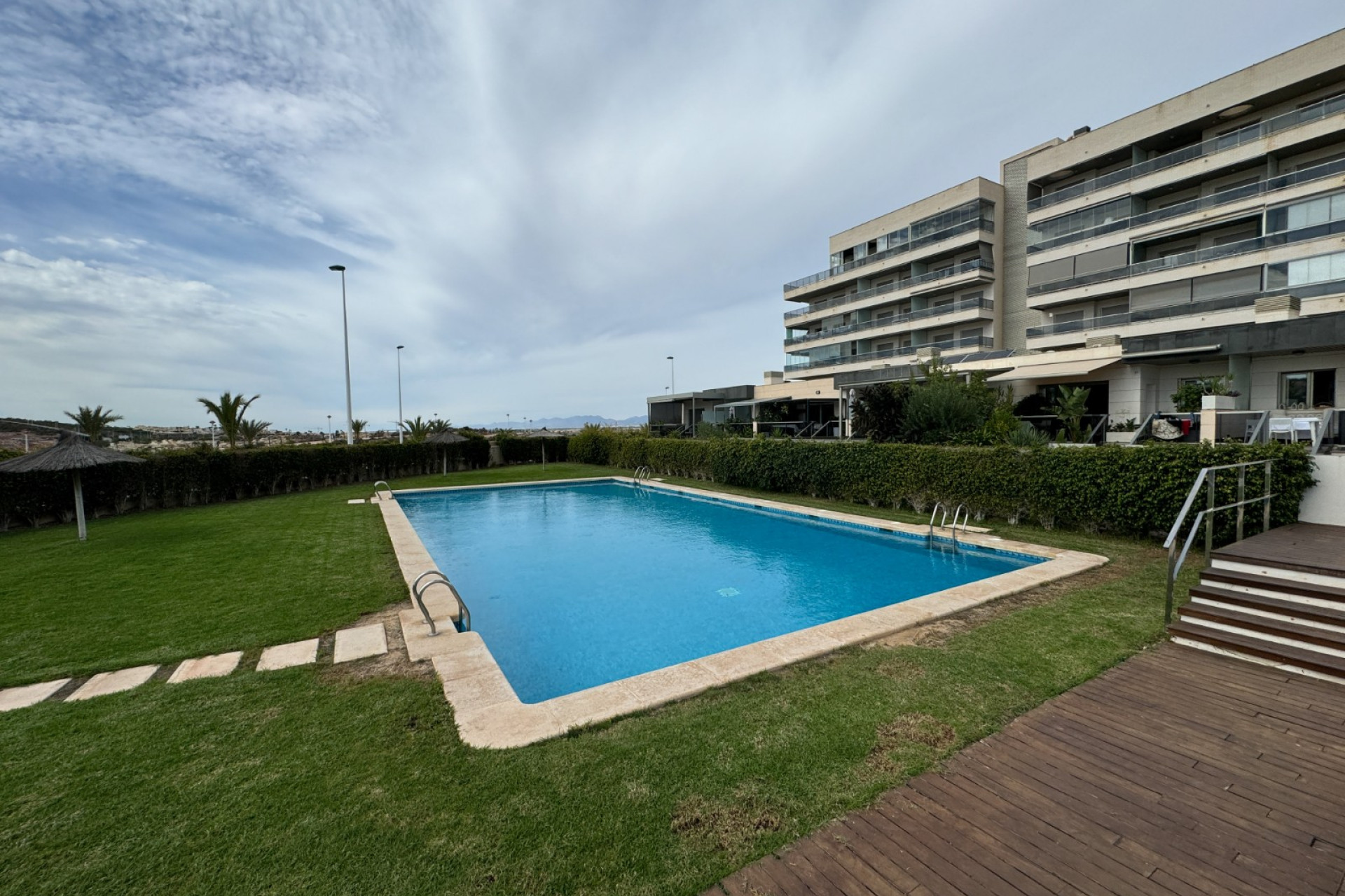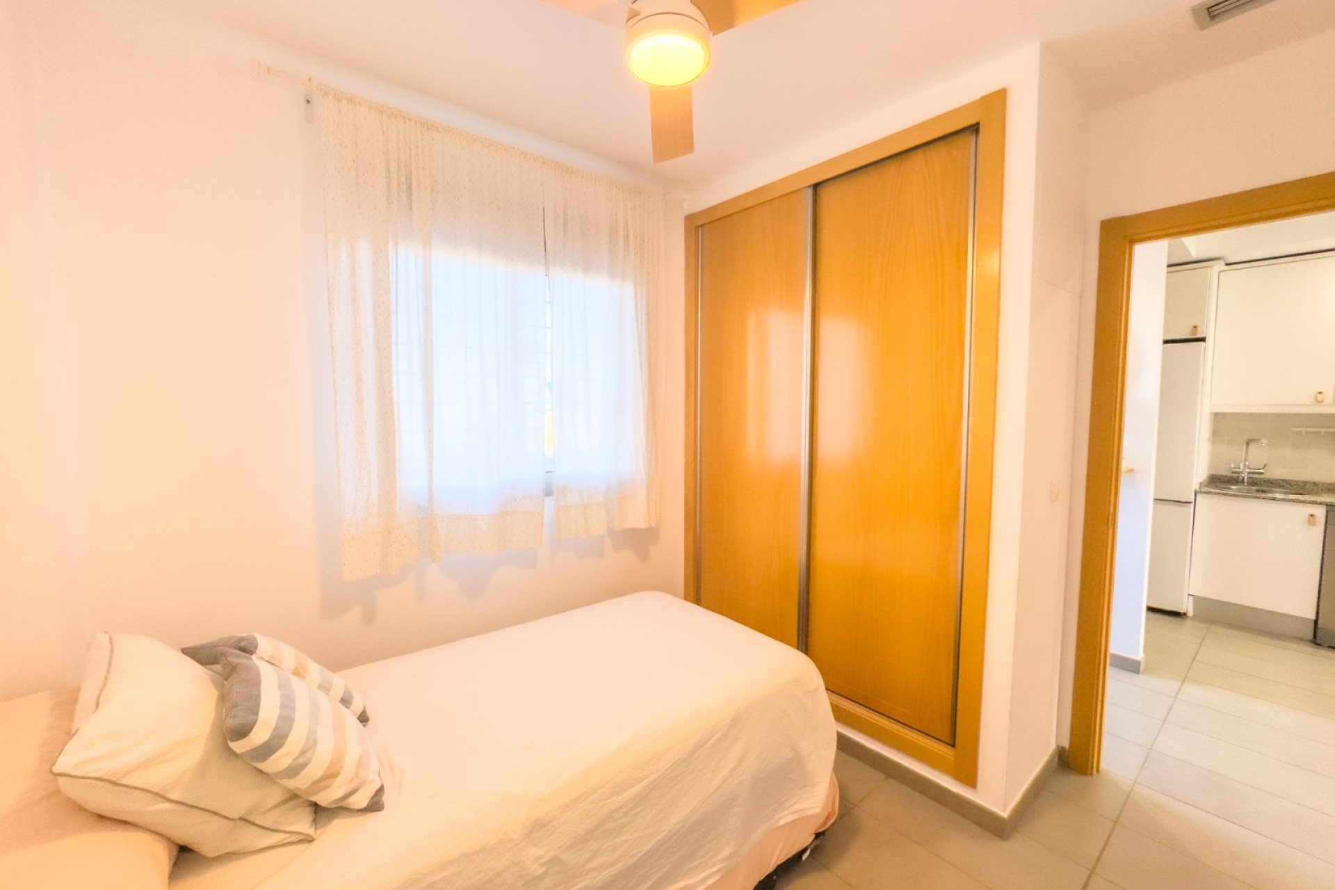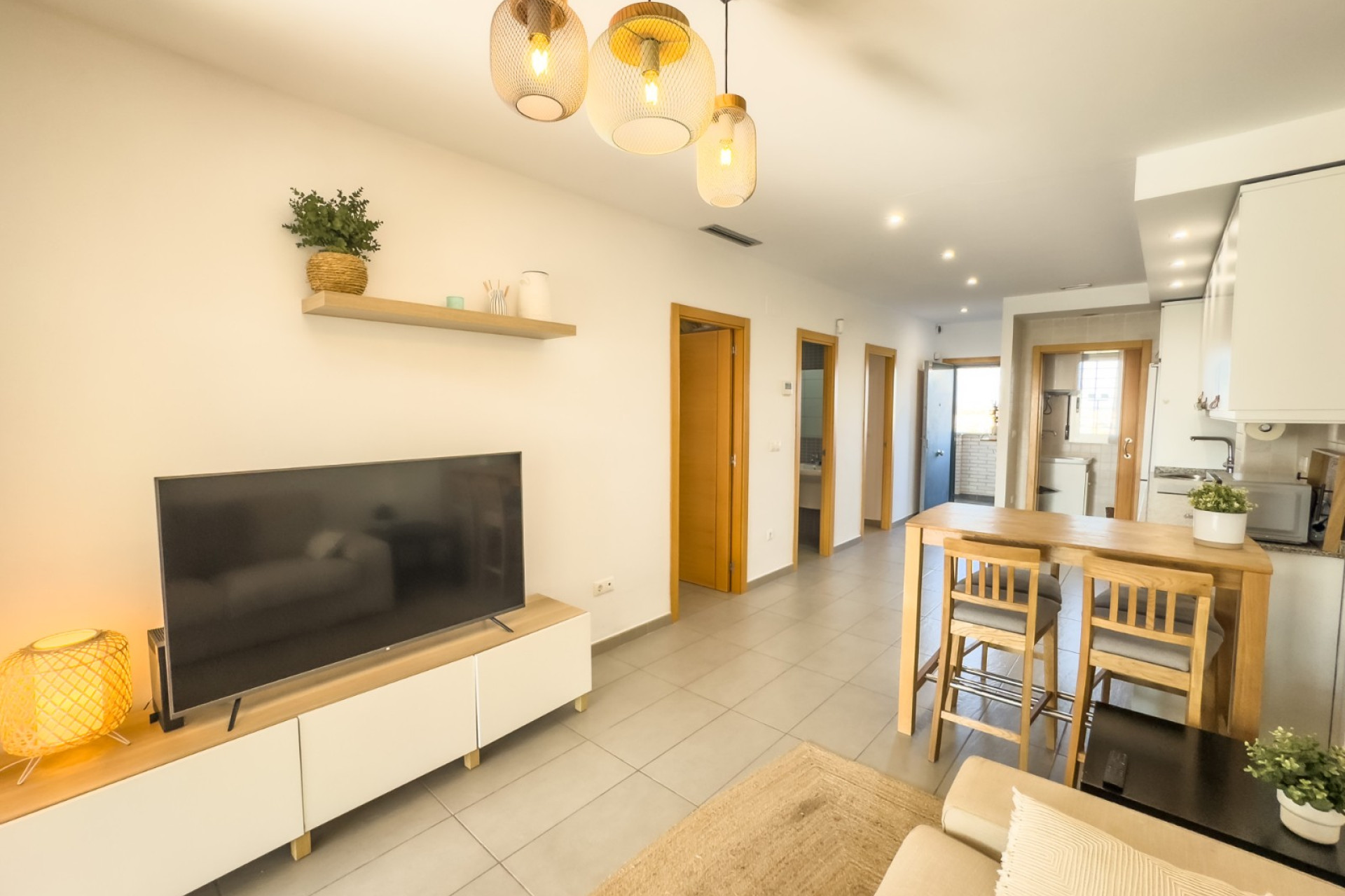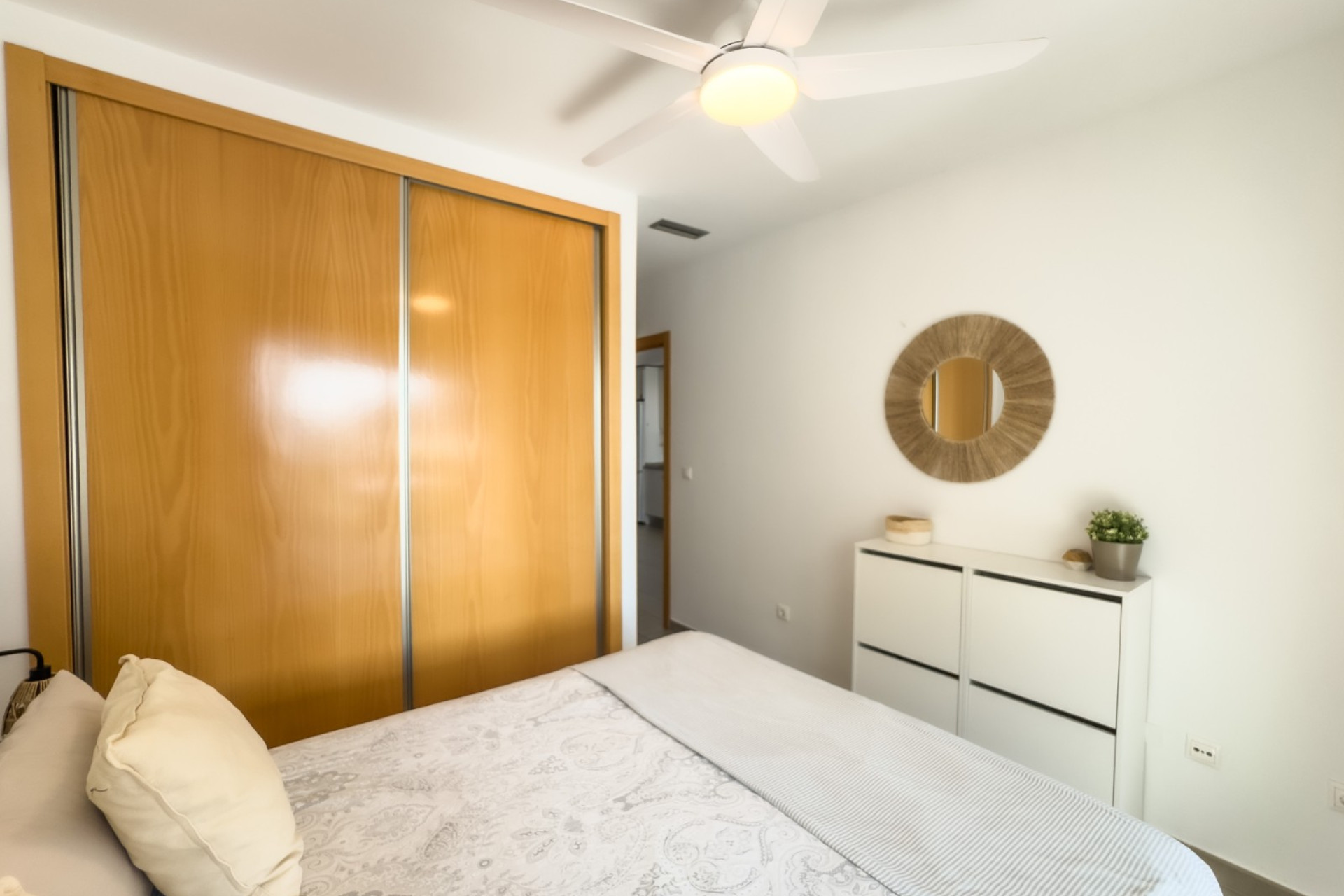Cozy apartment, very good qualities, fully equipped kitchen with fridge, microwave, induction cooker, electric oven, extractor hood, dishwasher, air conditioning by ducts throughout the house, cold and heat pump, large fitted wardrobes, two bathrooms with shower. East orientation, closed urbanization with elevators, 4 communal swimming pools with landscaped areas, community changing rooms, sports area with padel and football courts.