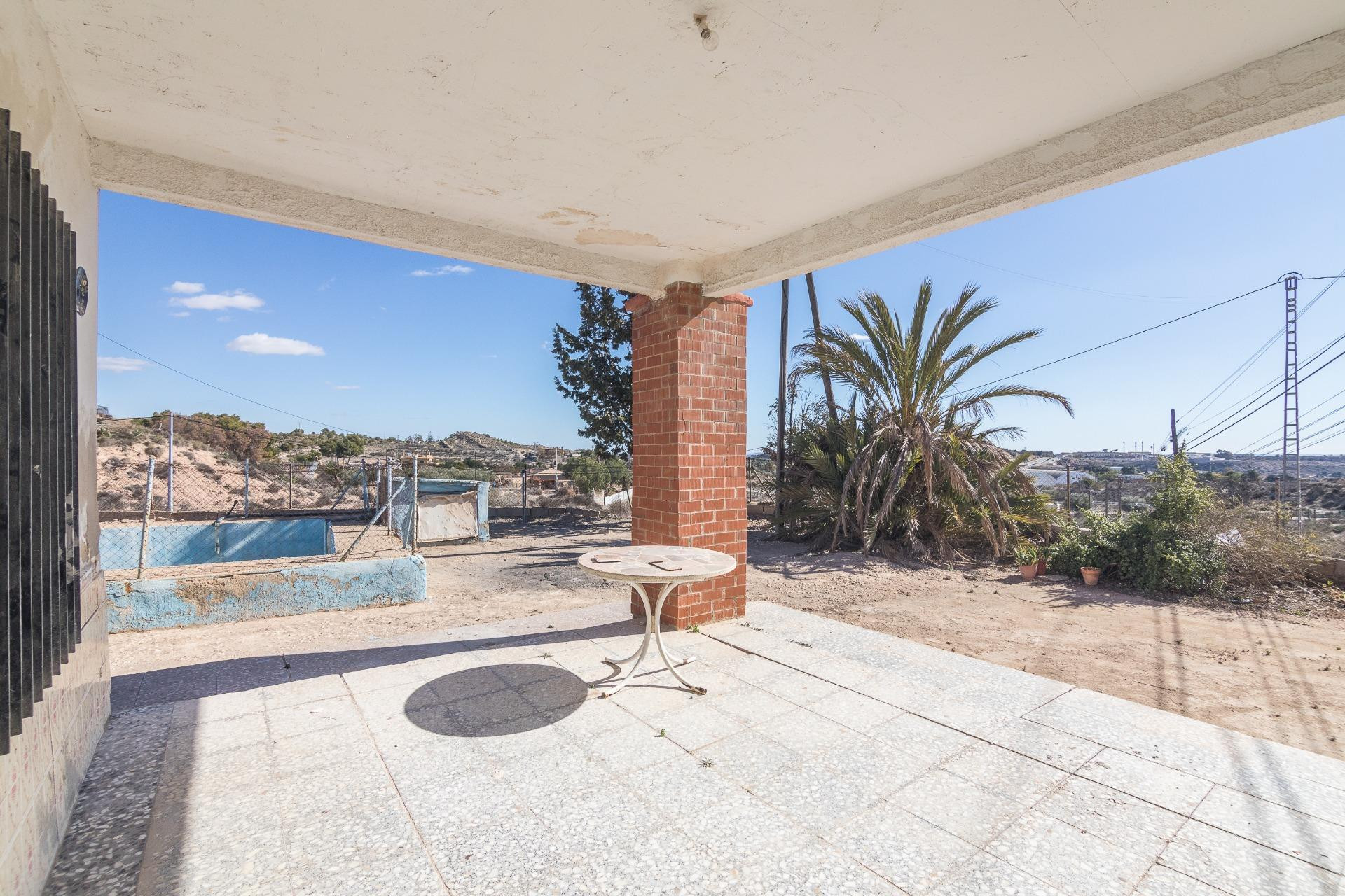 This property is a magnificent opportunity for those seeking to live surrounded by peace and quiet without being far from the city. Located on the road connecting Elche and Aspe, this home is currently undergoing renovation, offering the possibility to fully personalize it according to the tastes and needs of the new owner. It features 153.81 m2 built on a spacious plot of 3,140 m2.~The potential of this estate is enormous — ideal both for those who want a permanent residence and for those seeking a weekend retreat in a natural setting.~~The house includes a garage and a storage room, which could be integrated or converted into additional living spaces depending on the project. It also has a swimming pool that requires refurbishment, but once restored, it will become a wonderful space to enjoy the Mediterranean climate and the spectacular mountain views surrounding the property.~~The surroundings stand out for their calm and privacy, offering the feeling of being in the heart of nature while still being just minutes from all the services and amenities offered by both Elche and Aspe. This combination of serenity and proximity makes this property an ideal choice for those looking for a charming home with great potential in one of the most sought-after areas.~~Taxes, notary, and registration fees are not included in the sale price.