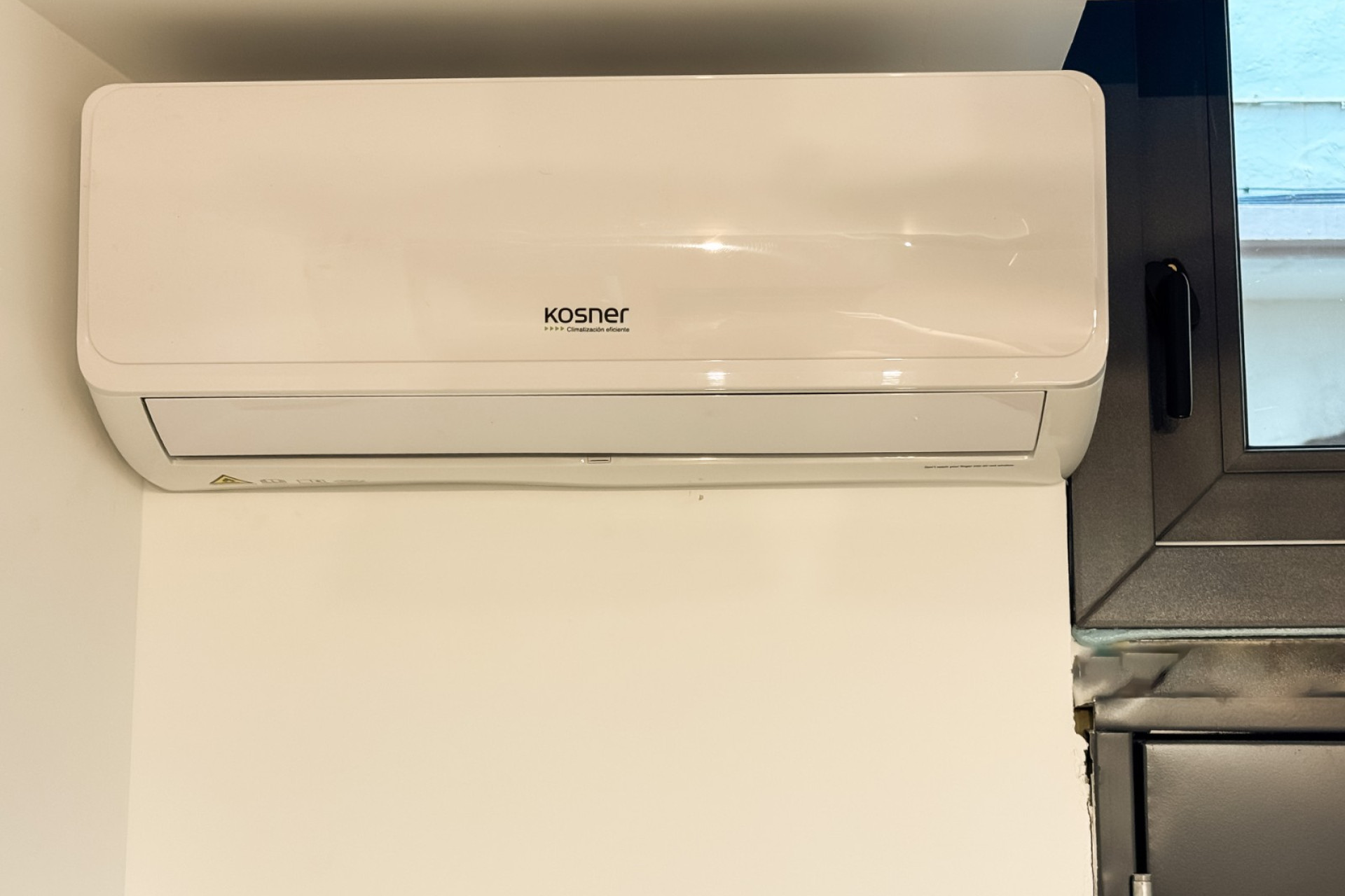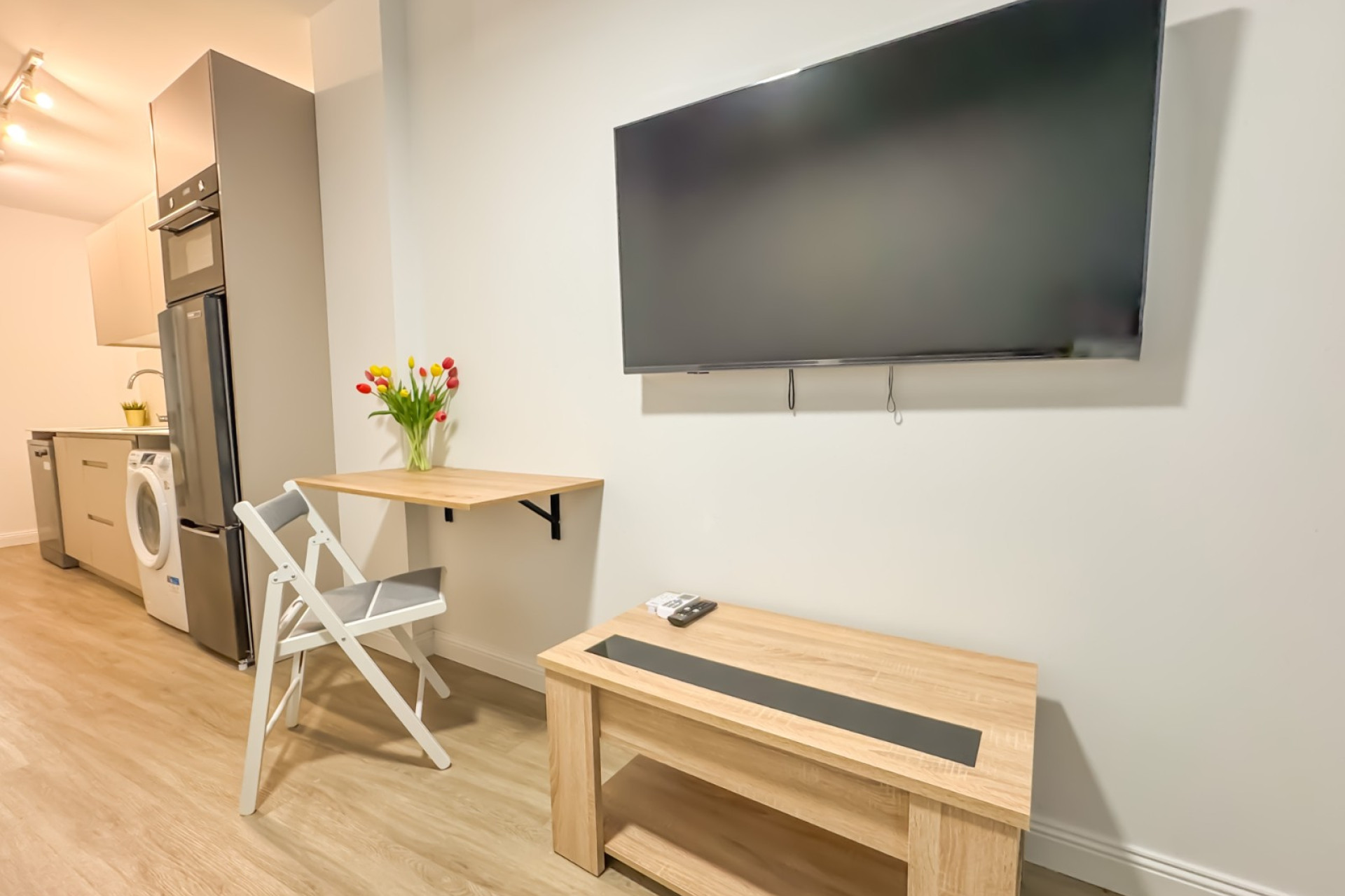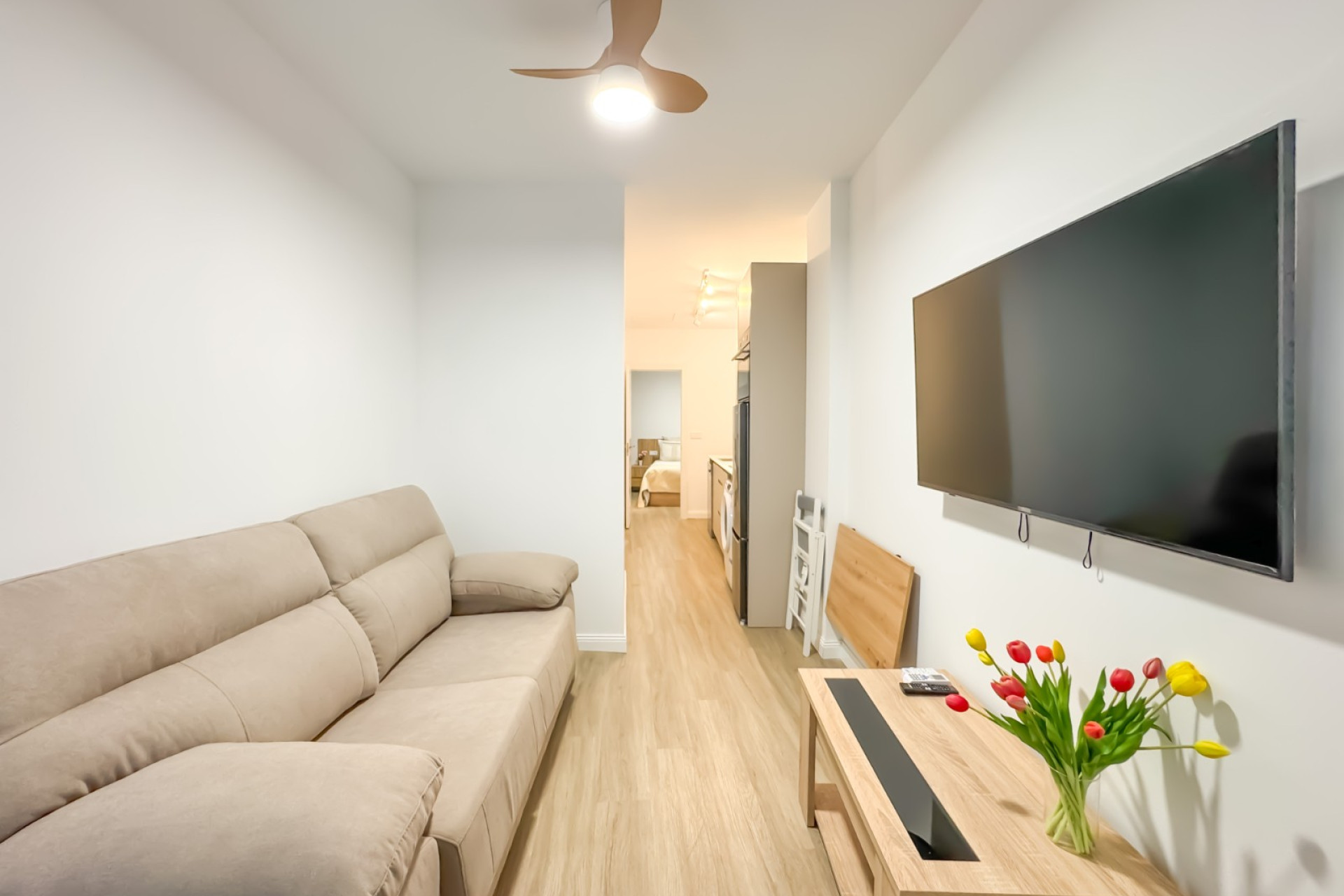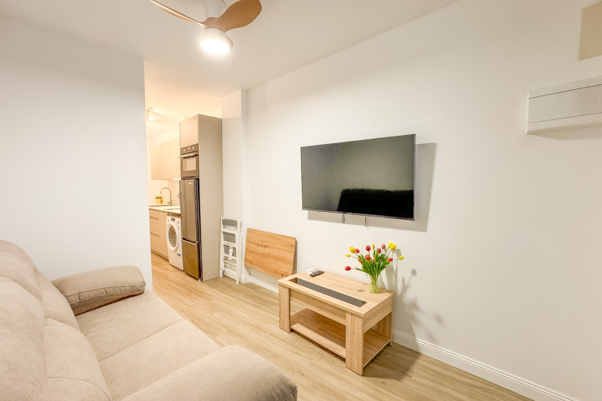 Living area with sofa,. smart TV, split air conditioning pump cold/ heat.