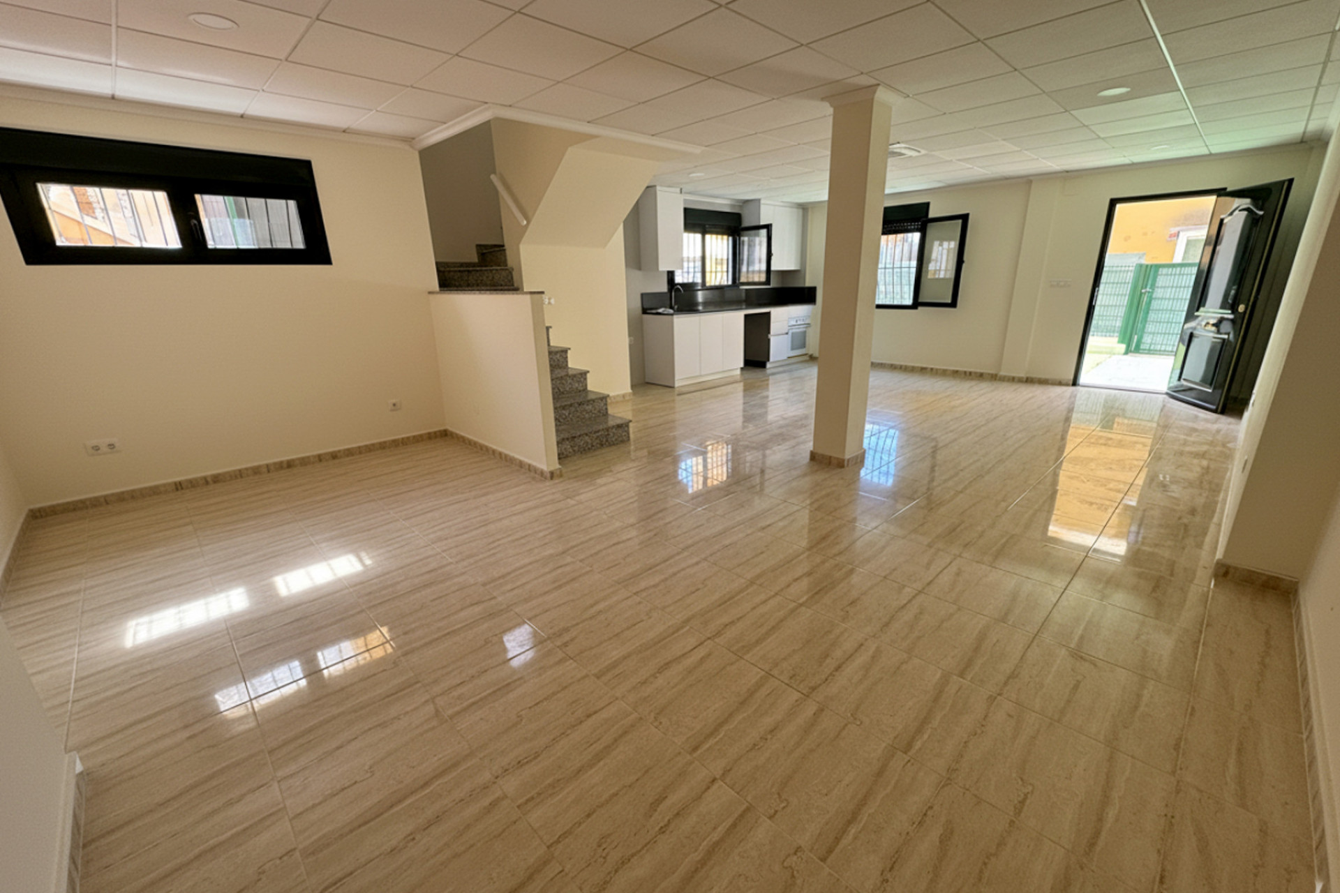 On the ground floor, the villa includes a bright living room with fireplace and a separate kitchen with access to an outdoor gallery. One bedroom and a full bathroom are also located on this level, offering practical comfort for daily living.